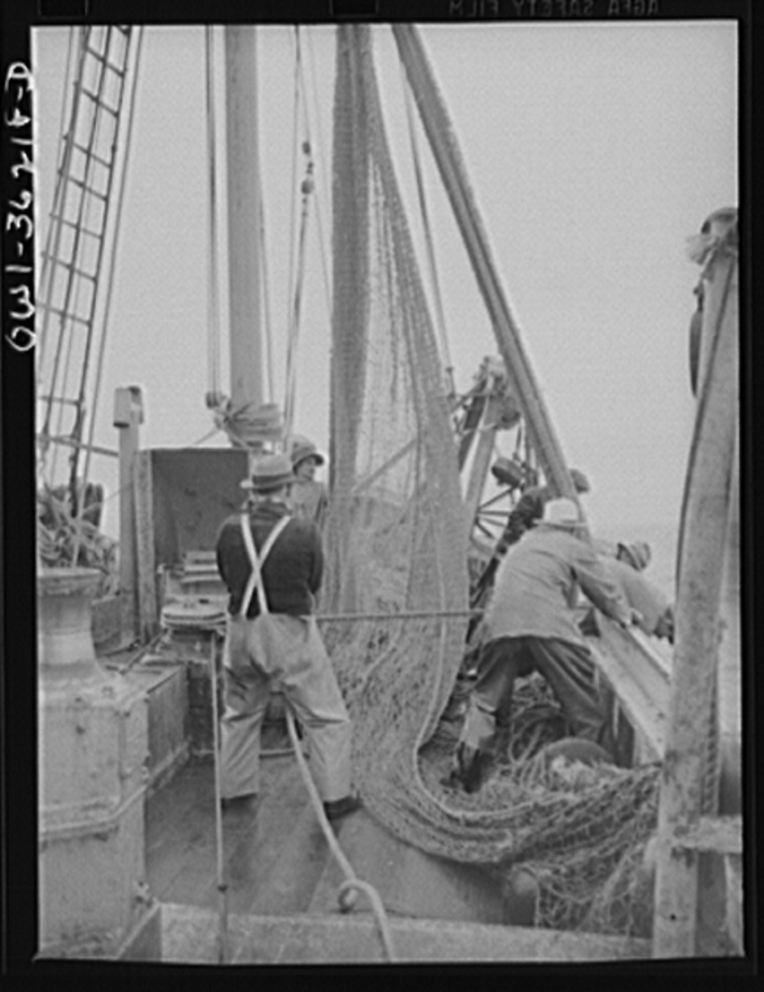 It was the Gloucester Schooner Old Glory that seined up the first reported tiny sargassum fish specimen. (Howard Liberman photo, 1942, aboard Old Glory, courtesy of the Library of Congress Online Catalog)