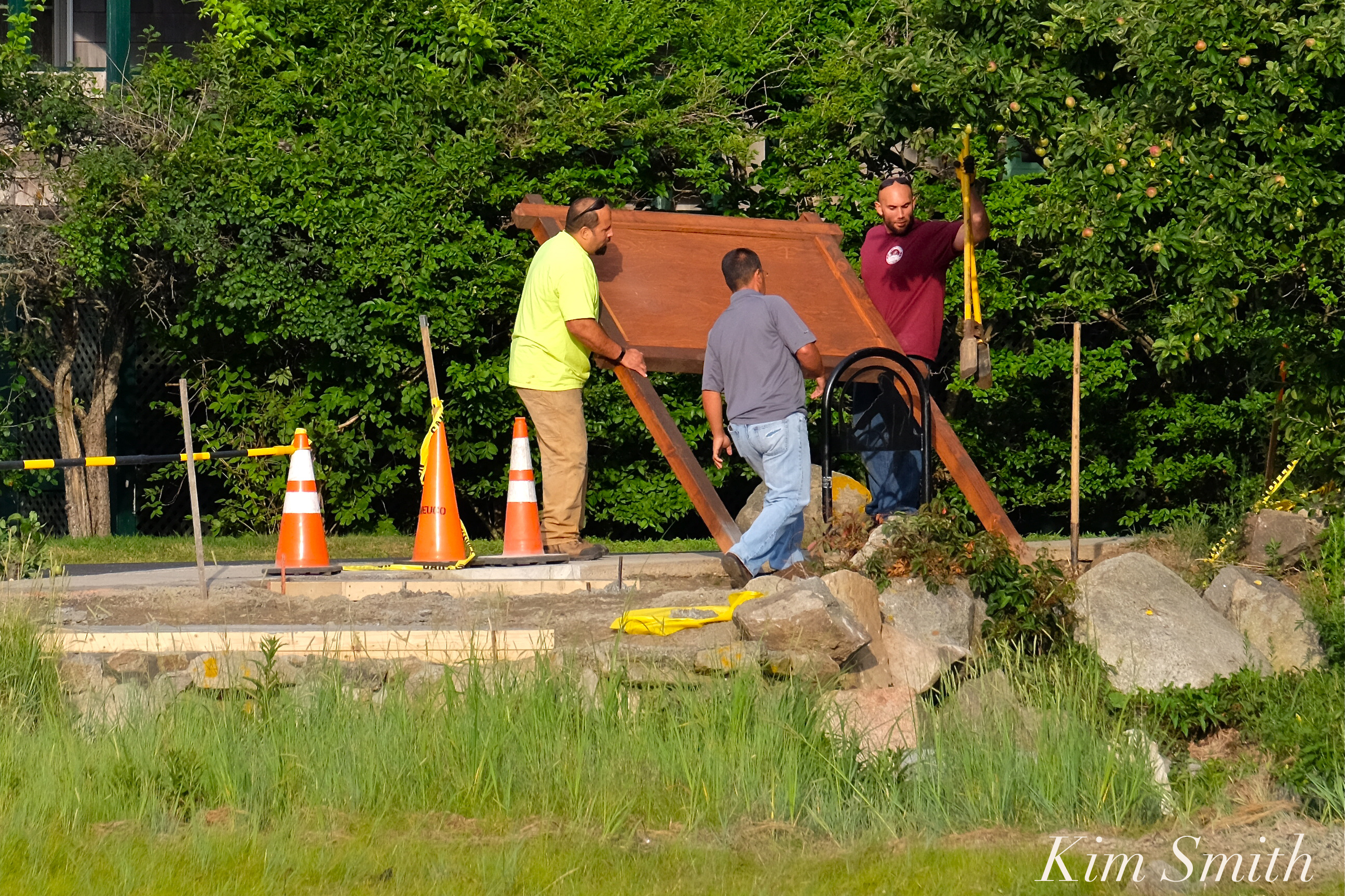 The new guest station at the footbridge end of Good Harbor Beach is progressing right on schedule, with today’s work entailing masonry and setting a granite stone border.