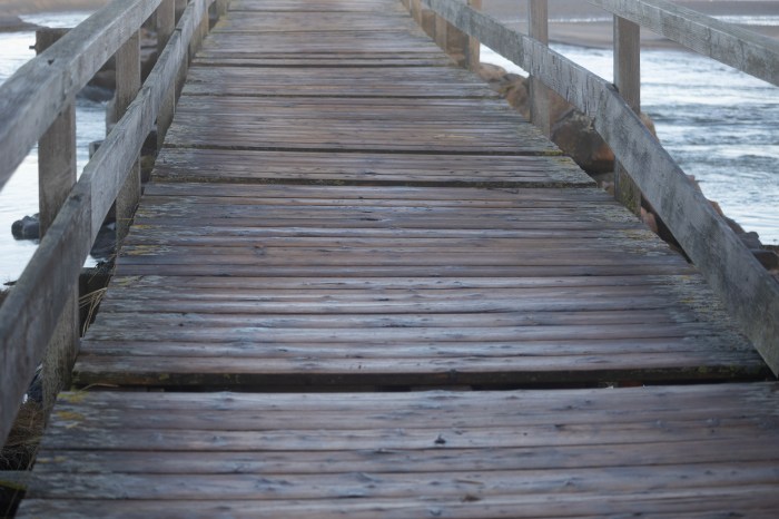 The footbridge took a beating during the storm yesterday, but still standing. Planks are missing and the bridge is closed.