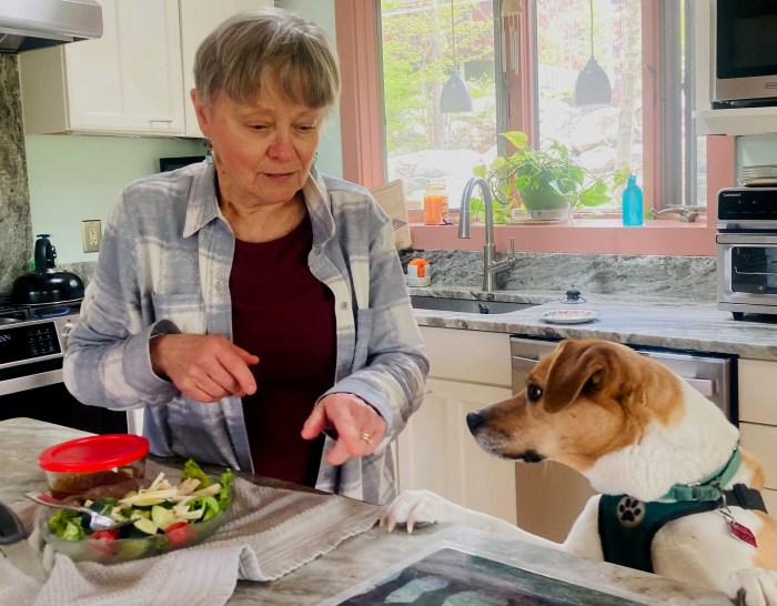 As I was making a salad the other day, Freddy my grand dog, decided to help me.  Thank you, Ericka, for the photo.
