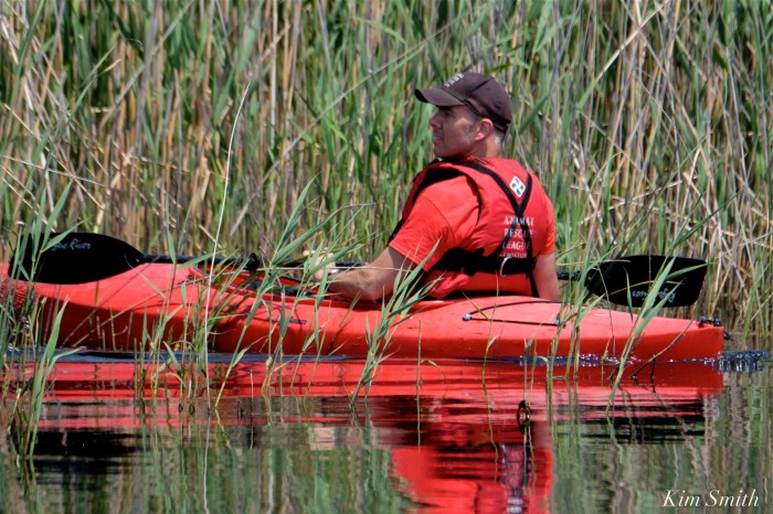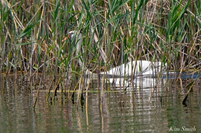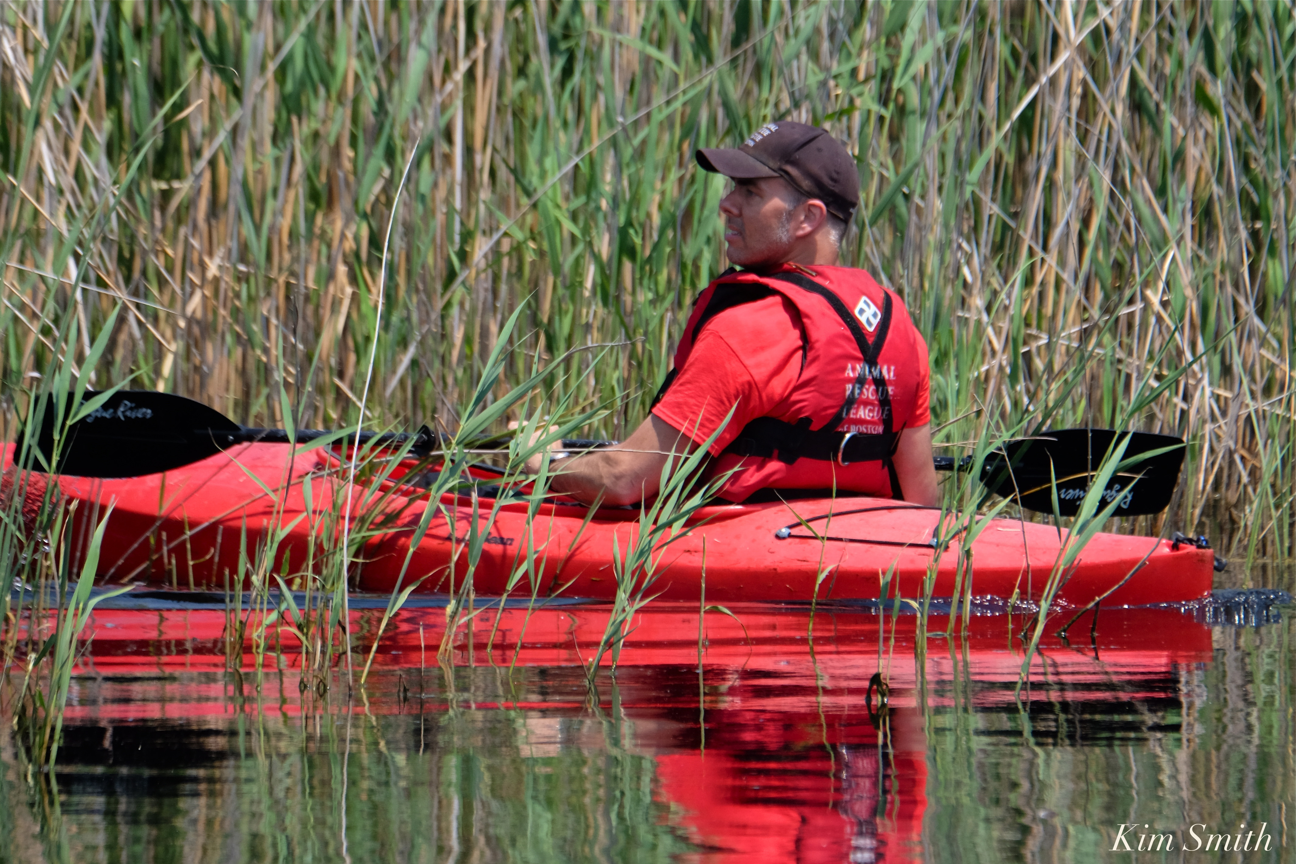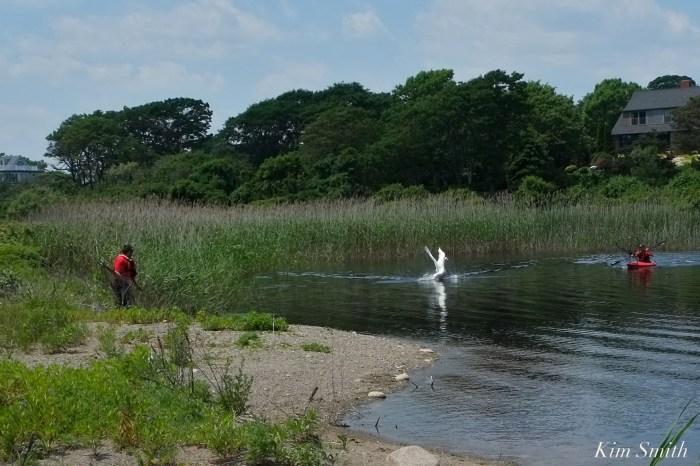 Coaxing Mr. Swan to the pond’s edge was easy when offered some favorite foods, but getting him to walk onshore was another story.  Out came the kayaks, where Mr. Swan led Bill and Mark on a wild swan chase back and forth from one end of the pond to the other. He skillfully led the workers through the thick reeds of phragmites, where he has a secret nest and many avenues of escape. At one point it appeared as though Mark had captured him with the swan-sized net, but he wriggled out and bolted free. We could see Mr. Swan panting and visibly tiring and at that point he slipped deep, deep into the reeds and was not seen again. We all came to the mutual decision that it was best not to continue as Mr. Swan was clearly super stressed and exhausted.