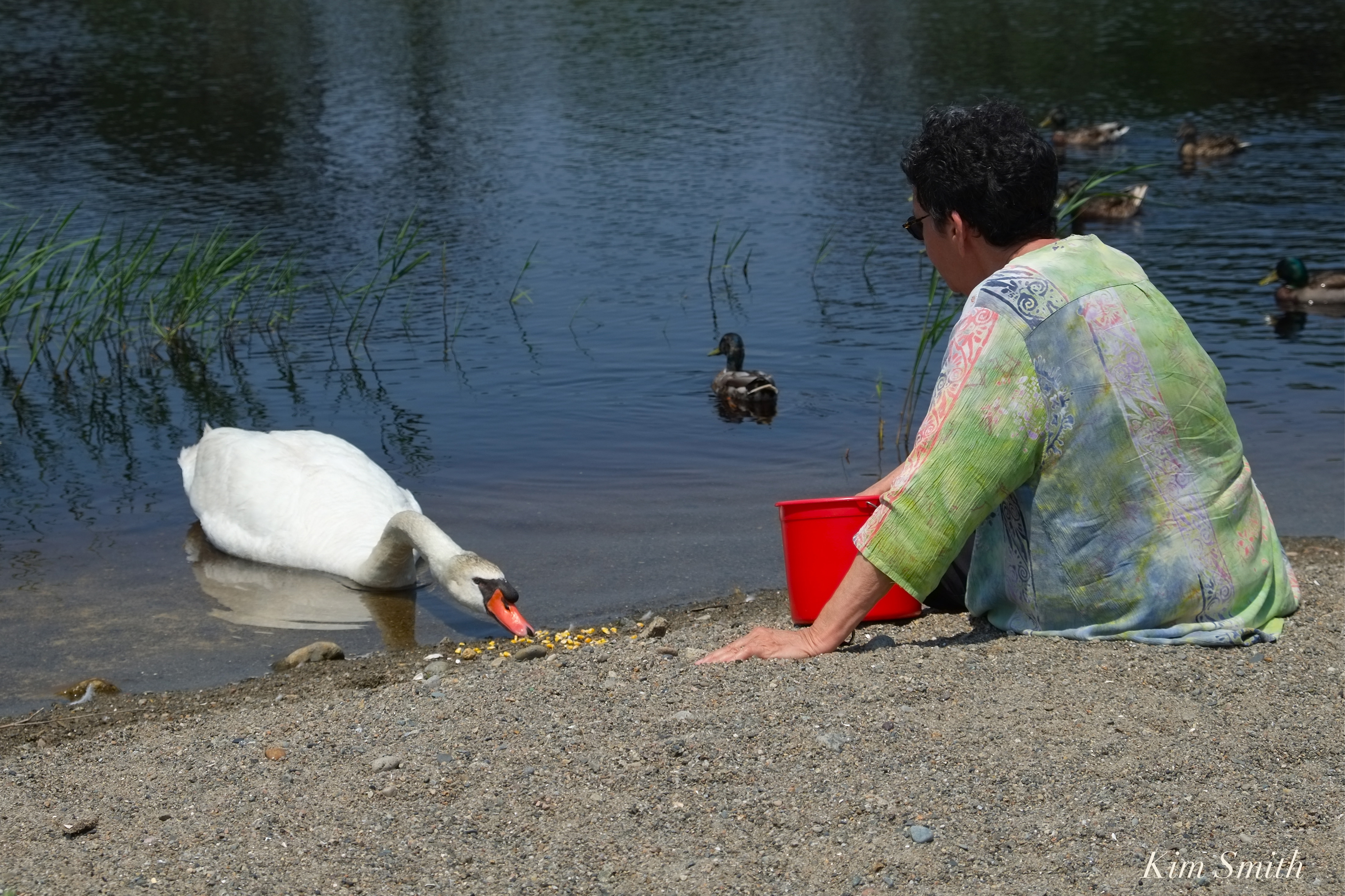 Mr. Swan has spent nearly the entire summer at Niles Pond, and he may never again return to Henry’s after the terrible debacle of his attempted capture. The day before the recent southeaster wind and rain event, Mr. Swan took off to Rockport Harbor and was seen there by his friends Lois, Joel, and Paul.