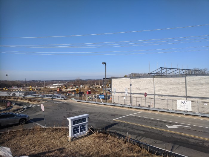 Sweeping drop view across construction sites to Gloucester Net & Twine building, Strong Group