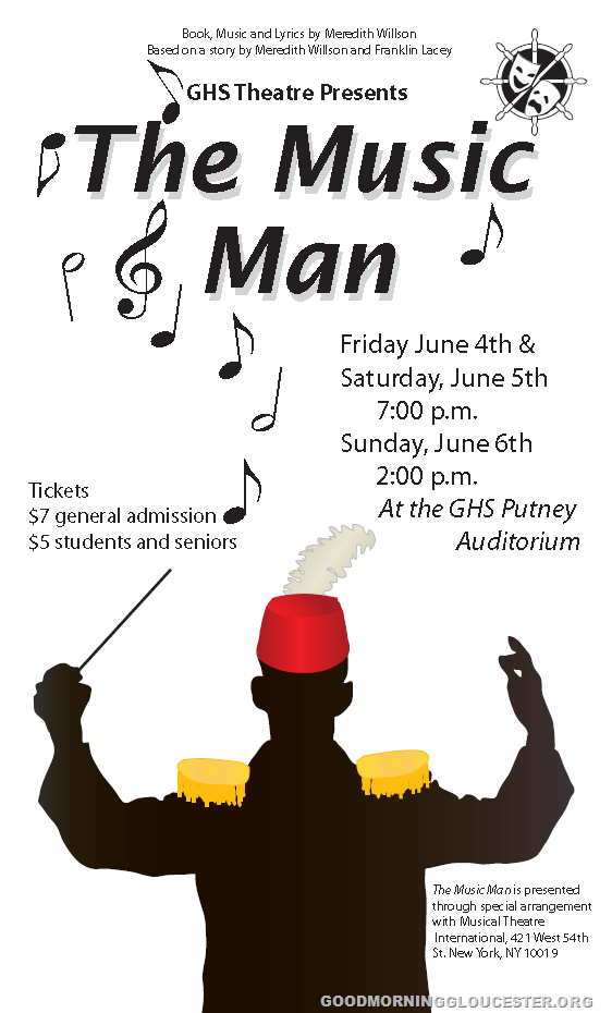 Gloucester – May 17, 2010 – The Gloucester High School Theatre Program will present The Music Man, June 4 & 5 at 7:00 p.m. and June 6 at 2:00 p.m. in the high school auditorium. This classic American musical (book and music by Meredith Willson) features small town charm, tunes you can hum (including “Seventy Six Trombones” and “(Ya Got) Trouble”) and a con man reformed by the power of love – a real crowd pleaser.