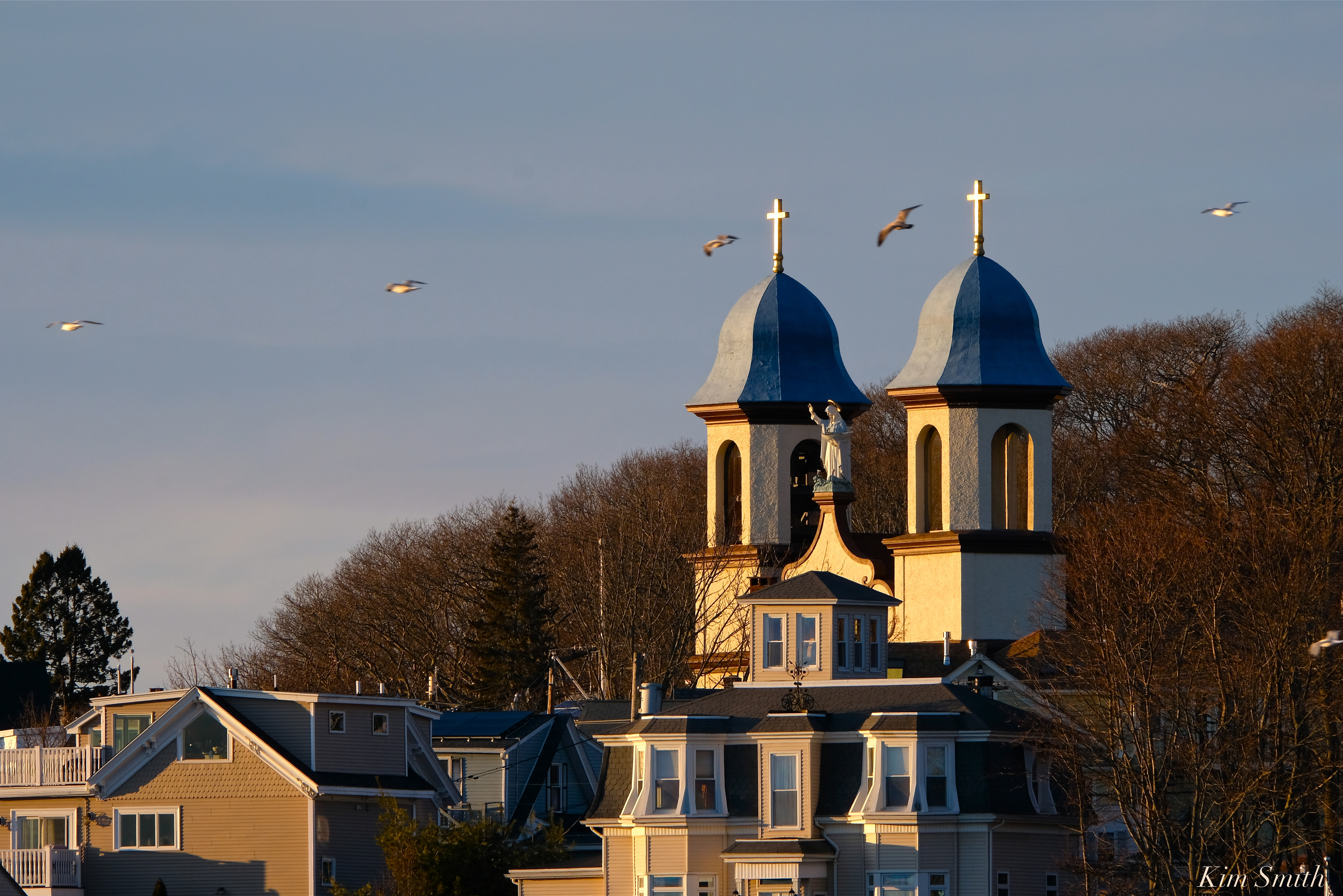 A fire destroyed the original church in 1914. Prominent architect Halfdan M. Hanson designed and immediately began building the existing, unique Mission style church, which replaced the earlier church. It is the only Mission style church in Gloucester. Modeled after a church in the Azores, Our Lady of Good Voyage consists of two distinct sections: the two-story main worship space that is of a cruciform plan and an L-shaped rectory that extends from the northwest corner of the main worship space. The rectory, which was built between 1872 and 1884 as a separate building, was incorporated into the new church. Resting on a granite foundation, the building is covered in a buff-colored stucco. Flanked by two identical bell towers, the central bay of the façade is pierced by the main entrance at the first level. A rose window adorns the second level, above which rises an ogee pediment supporting a pedestal and a statue of Our Lady of Good Voyage, who holds a boat in her left hand as a symbol of a safe voyage. In 1922, bells were installed in the towers. These bells, still in place today, were cast by John Taylor & Company of England-the same foundry that cast Philadelphia’s Liberty Bell.
