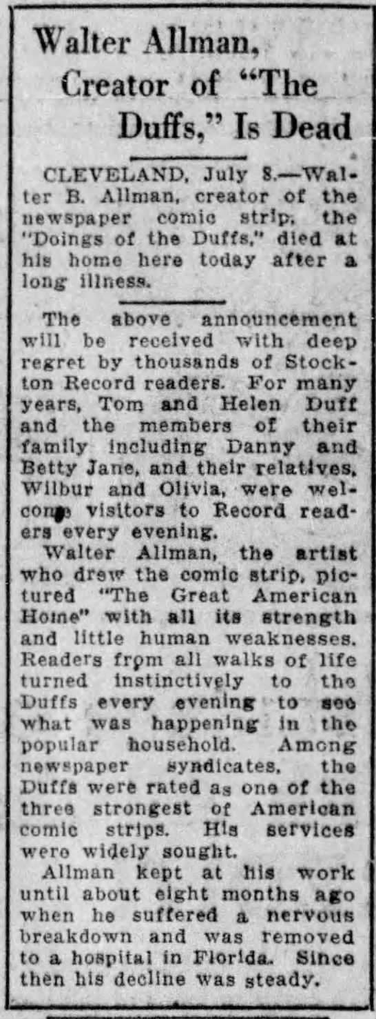 I don’t know if Allman had the flu personally but he did battle that punishing schedule. And he had a baby in 1917, so there’s his life as a dad in the mix. Sadly, he had some type of health issue or breakdown for months before dying in 1924. Others continued the Duffs strip for nearly a decade. (**Author note: Look again at the Federal guidelines related to Influenza methods of control September 26, 1918 and artists for whom interiority was an intrinsic source of inspiration like Munch, Woolf, and Porter. Severe mental health after affects were forewarned and expected: “Former epidemics have been characterized by marked mental depression.” Madness hung in the flu air– and suffering from shell shock and other effects from the war broadcast in newsreels. **)