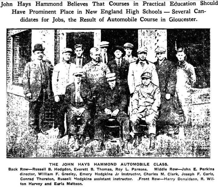 “John Hays Hammond, who is a member of the Gloucester school committee, offered to maintain, for a year at least, a class of high school boys in automobile instruction…