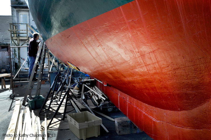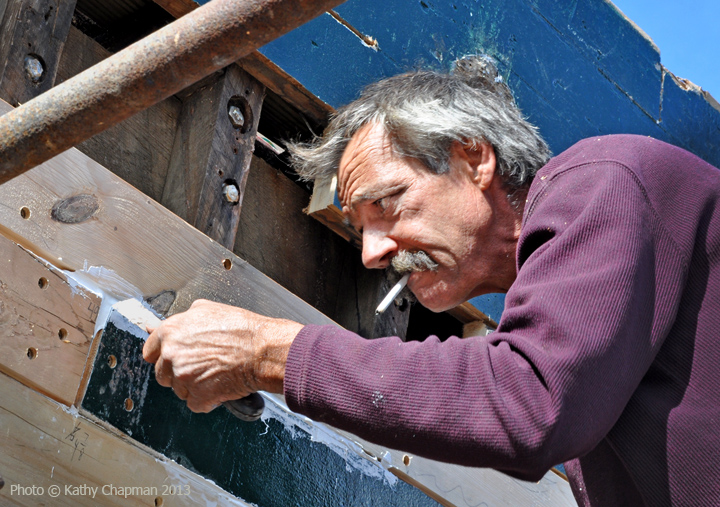 Kathy and Marty were back at the Gloucester Marine Railways this week to check out the Schooner Adventure with Restoration Coordinator Geoff Deckebach. Caulking and other repairs and improvements are underway as the restoration of Gloucester’s flagship continues.