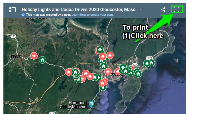 The map is great in the embed mode because when you scroll down, each house photo(s) pop up, with a big arrow that directs you to that one point. From a desktop, hovering or right clicking the house icons reveal the photos for each pinpoint. For those who prefer a paper copy –which doubles as a seek and find sheet–click on the three vertical dots and then select “print” (horizontal mode best) from pull down menu. You can also google search Holiday Lights and Cocoa Drives Good Morning Gloucester.