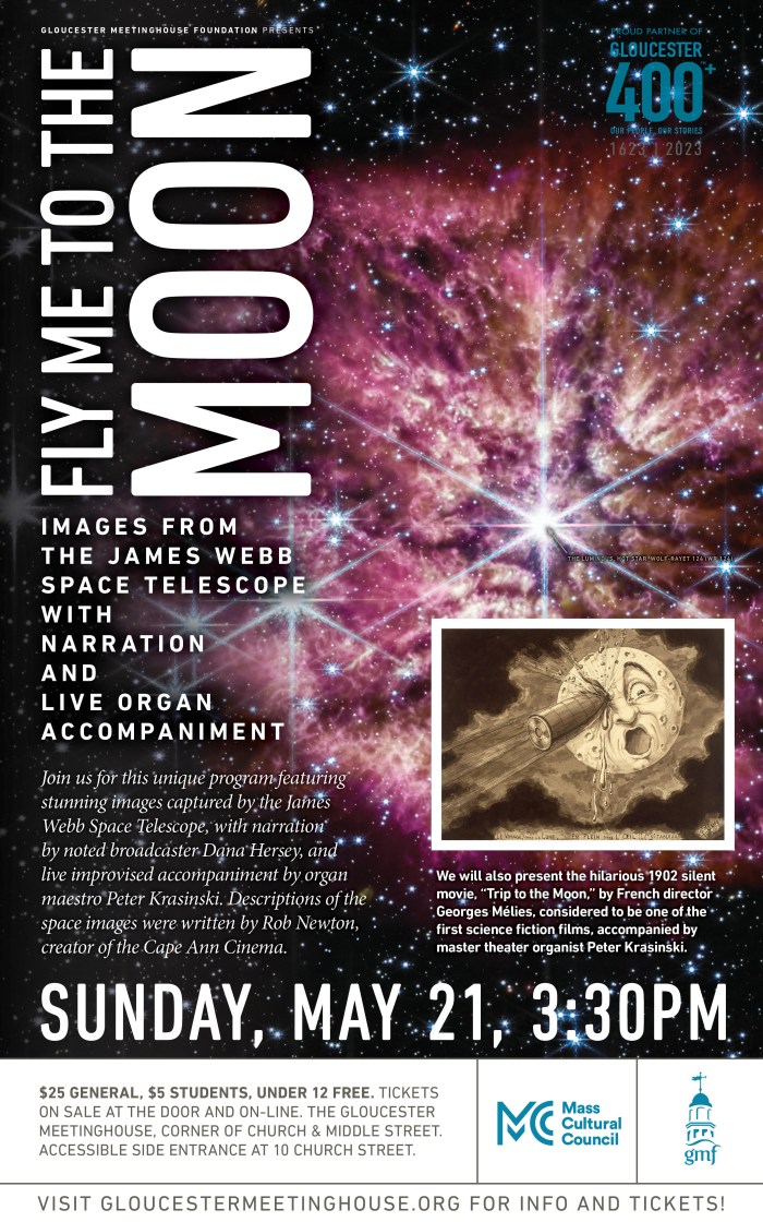 On Sunday, May 21, at 3:30 p.m., the Gloucester Meetinghouse Foundation presents a unique program featuring stunning images captured by the James Webb Space Telescope, with narration by noted broadcaster Dana Hersey, and live improvised accompaniment by organ maestro Peter Krasinski. Descriptions of the space images were written by Rob Newton, creator of the Cape Ann Cinema. The program opens with the hilarious 1902 silent movie, “Trip to the Moon,” by French director Georges Me̒liès, and is considered to be one of the first science fiction films. The event will be held at the Gloucester Meetinghouse, corner of Middle and Church Streets, and projected on a large screen in the darkened room. The Foundation specializes in offering family-friendly programs that are not available anywhere else for the entertainment and good of the whole Cape Ann Community.