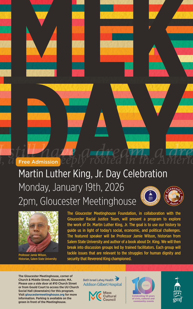 Organizers of this event include Jerry Ackerman and Karen N. Bell, co-chairs of the Gloucester Meetinghouse Events Committee, and Michea McCaffrey, Chair of the Gloucester Racial Justice Team. A special sponsor of the event is the Beverly & Addison Gilbert Hospitals, a member of Beth Israel Lahey Health. This annual MLK Day program in Gloucester is part of the Meetinghouse Tenth Anniversary series.