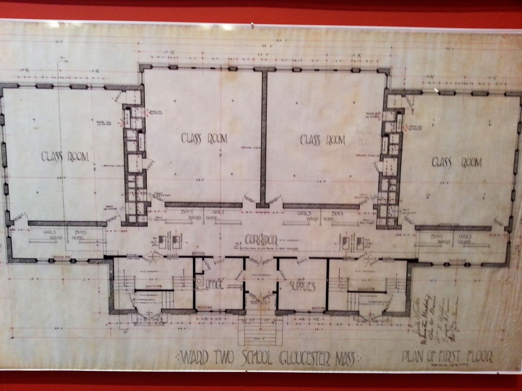 The former Eastern Avenue School (85 Eastern Avenue) was the site for the monumental mural, Schooldays, by Frederick L. Stoddard, from 1936. This multi-panel triptych was painted 8 feet high and nearly 60 feet long despite an array of unusual architectural challenges. My hunch for its original location on the main floor was confirmed thanks to Barbara Tarr. I’m looking for interior photos of the school that show the mural installed. Over time the school walls were resurfaced, doors blocked, and an elevator installed. Based on my expertise, I recognized that a stand alone piece was misattributed and must have been dispersed, not as bad as the scarecrow in the Wizard of Oz after the flying monkeys descend-… still it was dire and will be amazing to have it whole once again! Special thanks go to Gloucester’s Department of Public Works.