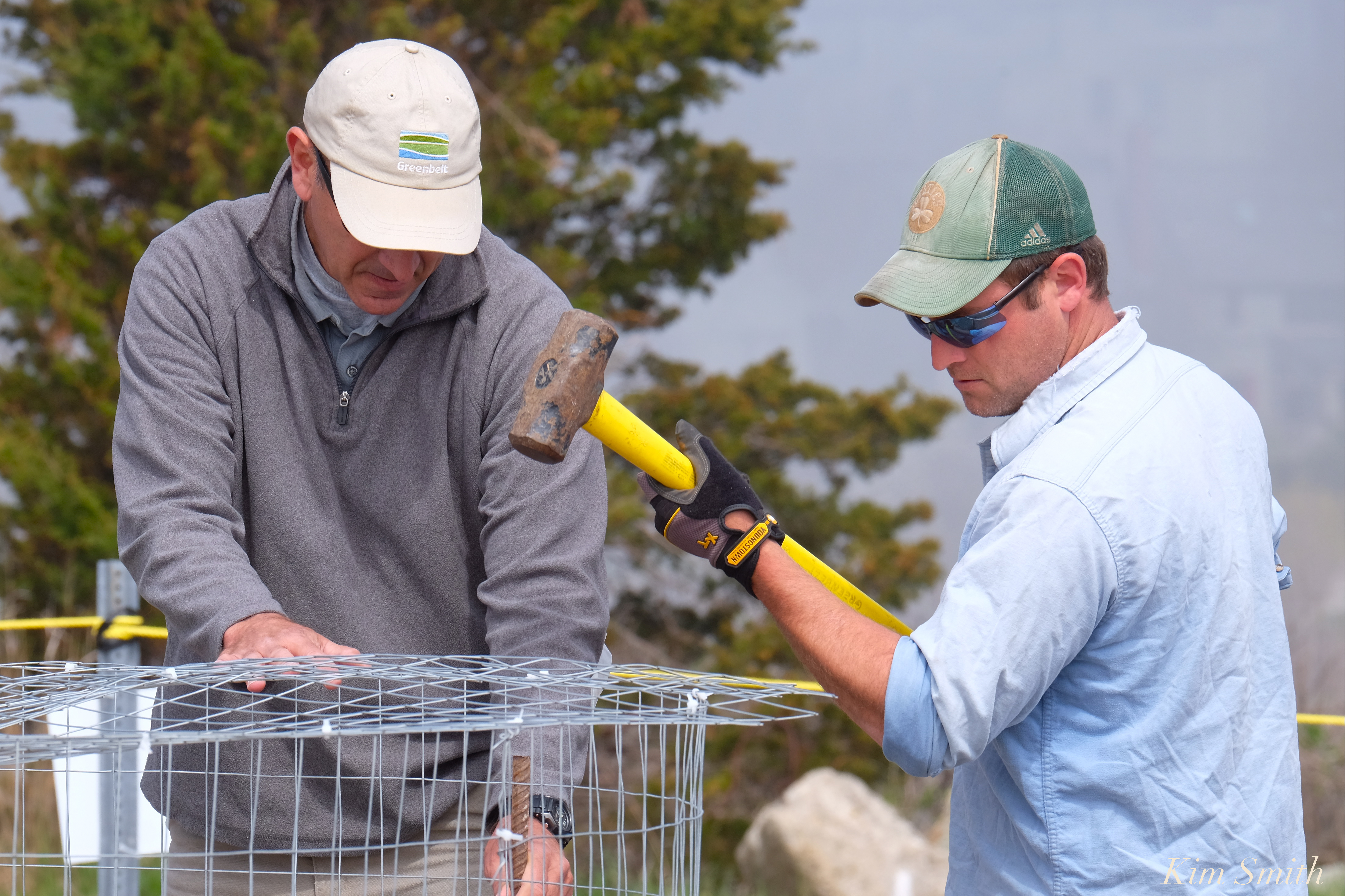 Dave and Fiona constructed the wire exclosure outside the nesting area to minimize disturbance. With great caution, they approached the nest. It was Papa’s shift and he valiantly tried everything he could to try to distract us from his nest of eggs, piping loudly and running very near to Dave and Fiona while displaying a “broken” wing. It only took the two of them fifteen minutes to place the exclosure around the nest, and within a moment after completion, Papa was back on the nest brooding the eggs.