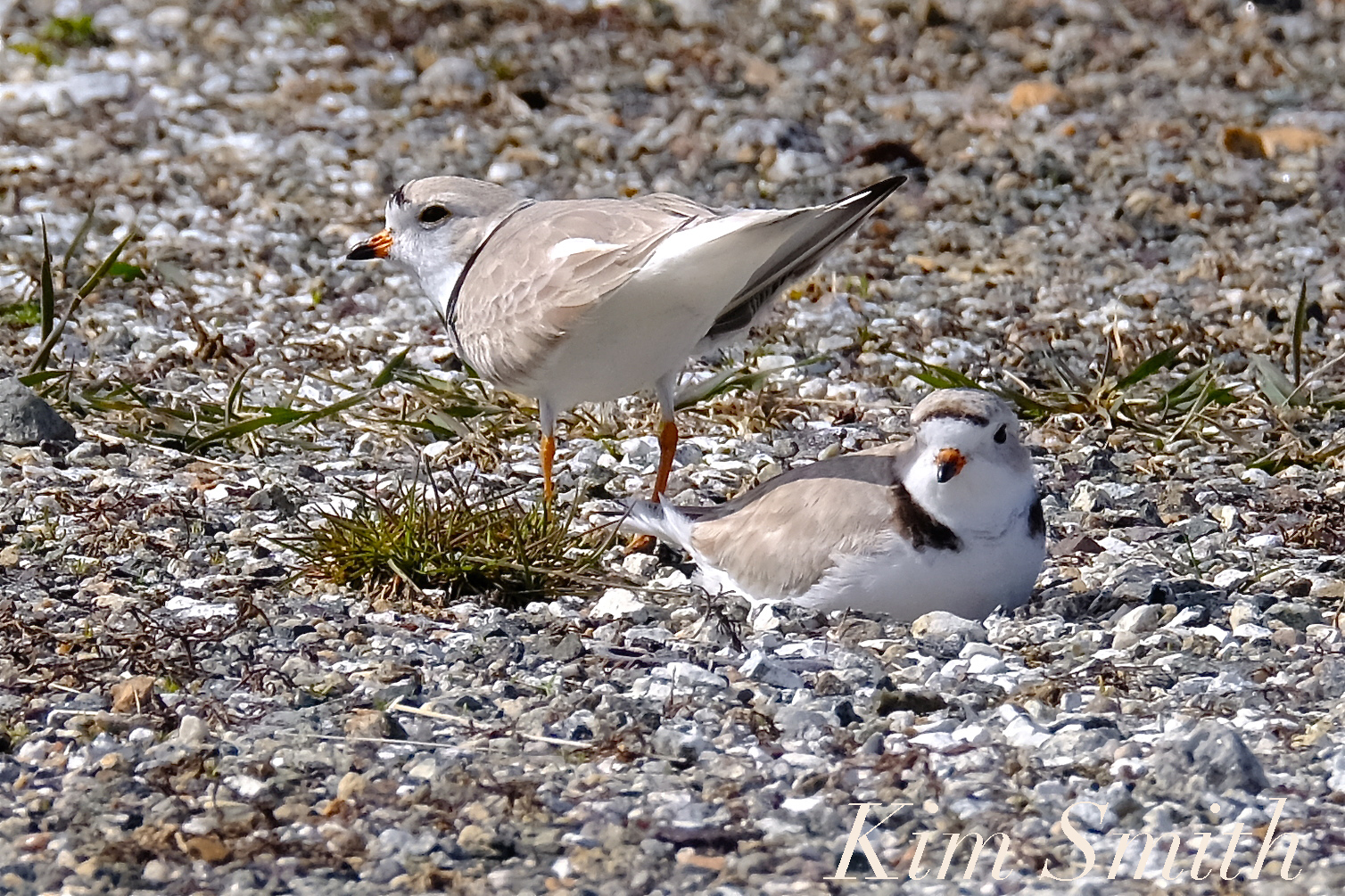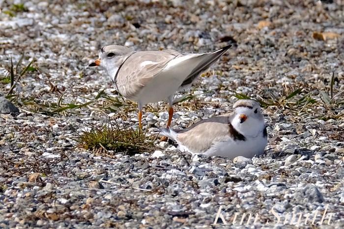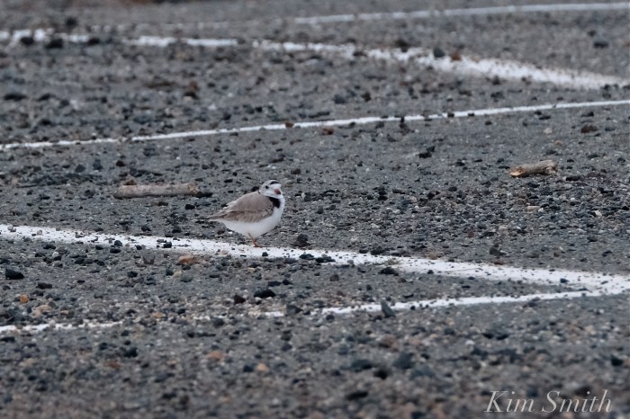 April 2019 – For the second year in a row, the Piping Plovers are again shunted off the beach and into the parking lot. They return to the white lines, make a nest scrape, and are courting