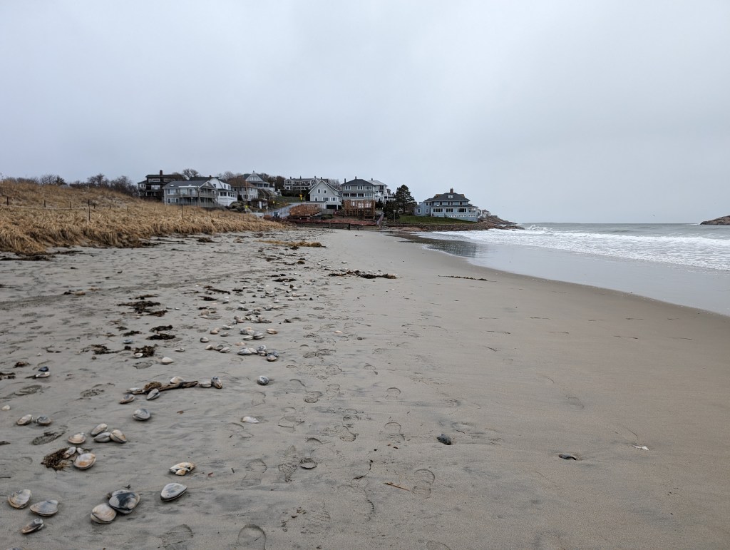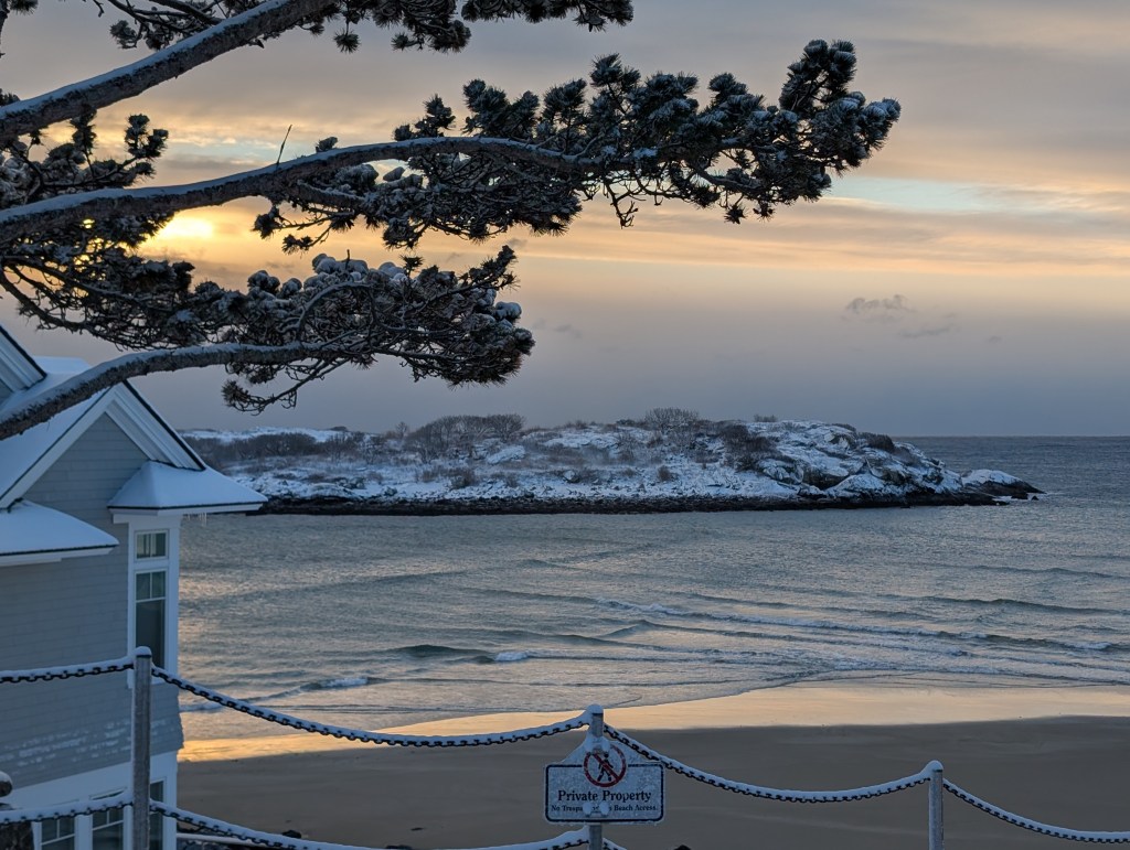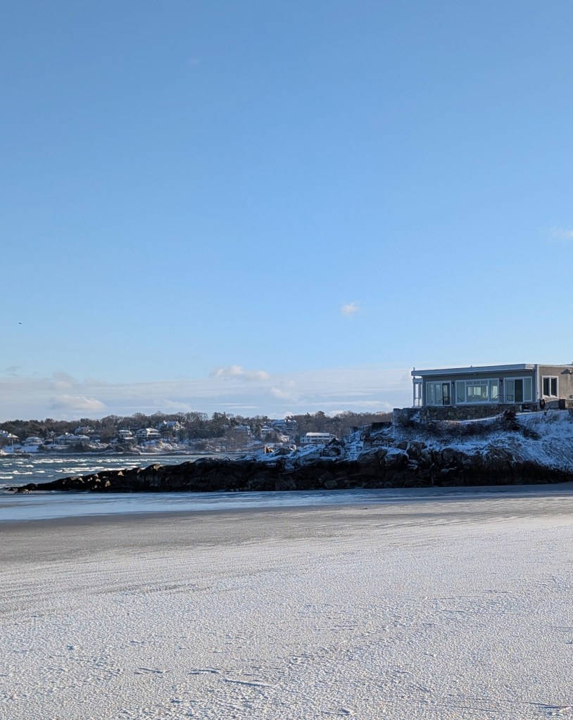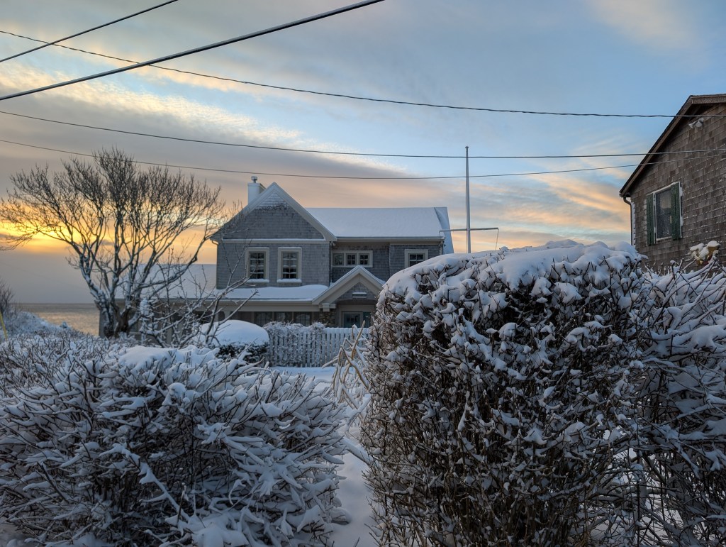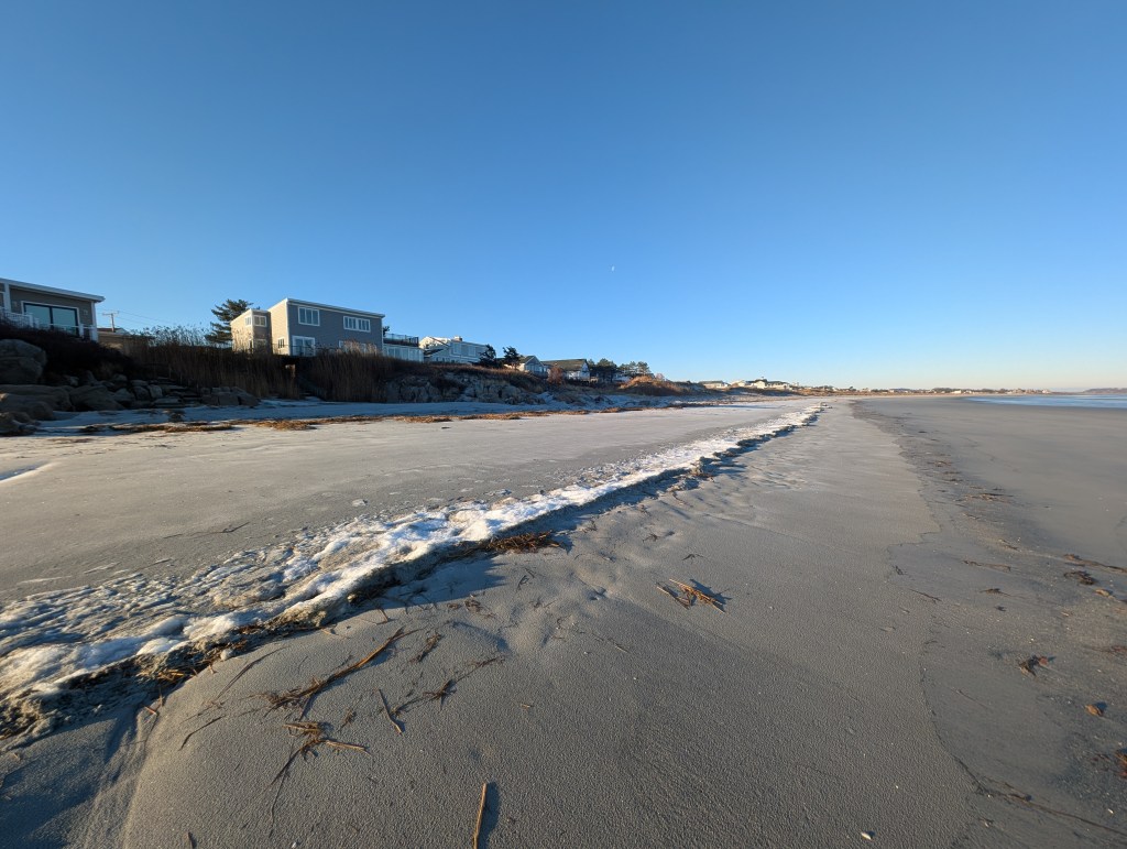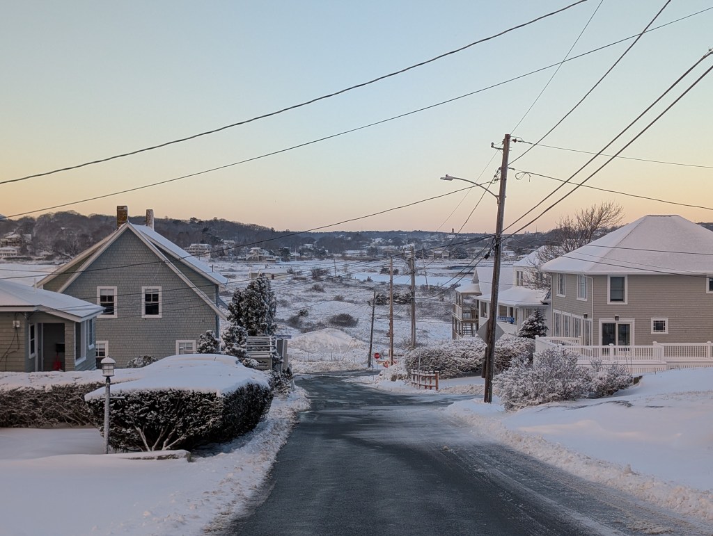 photos and video: Rooftops, beaches, and robins. Views from the road plus two winter walks on Wingaersheek Beach–yesterday vs. snowfall today. Jan. 19 (icy blue puddles and sheen) vs. Jan. 20 (yellow light, soft and silent).