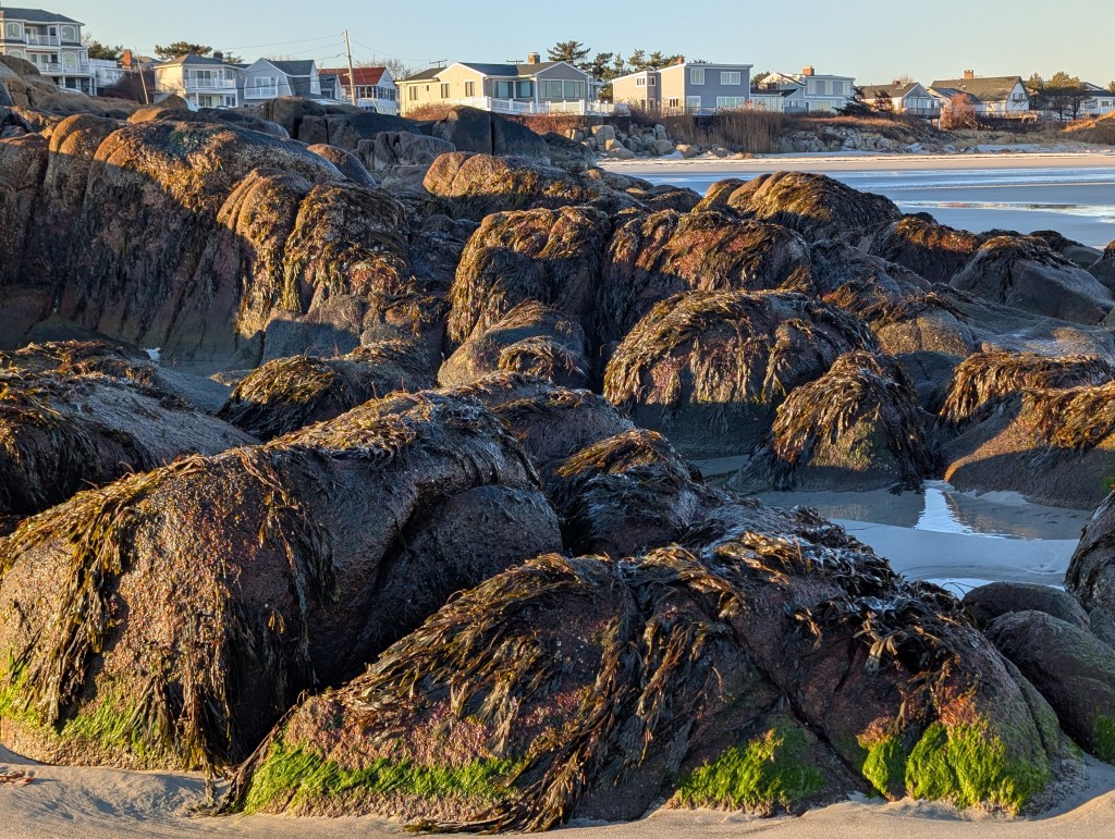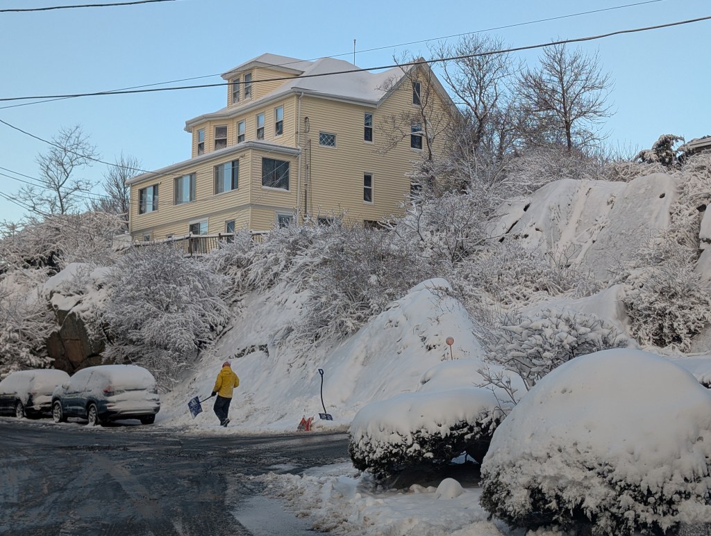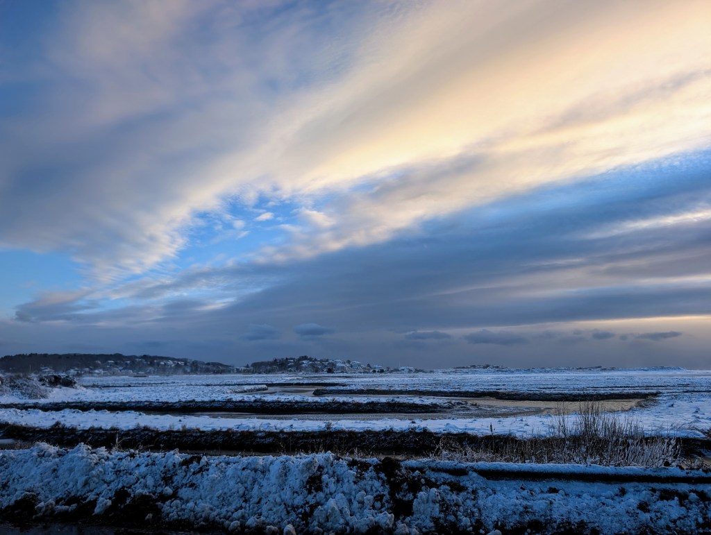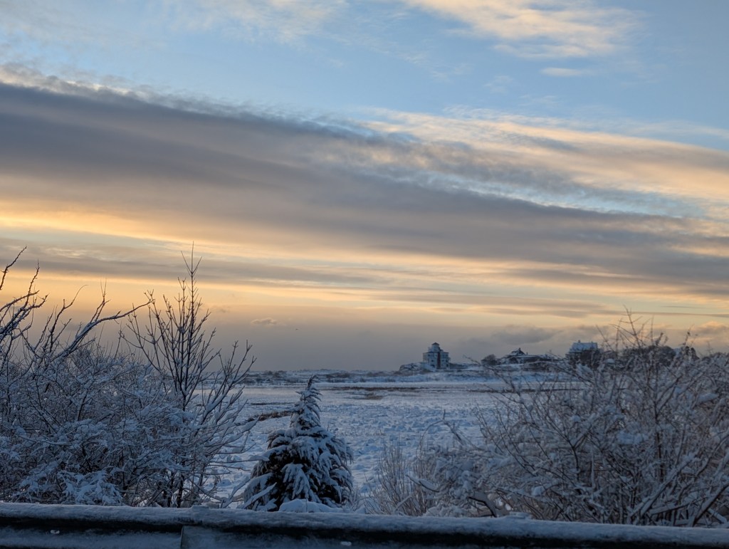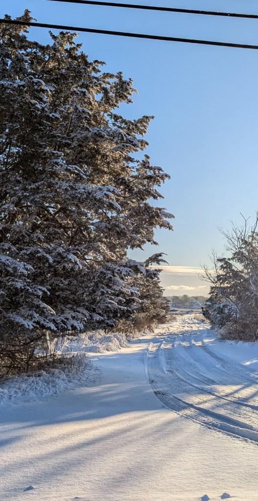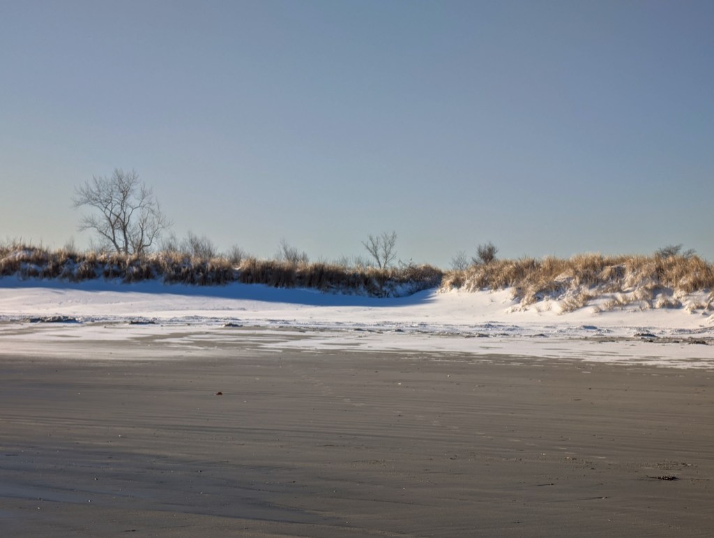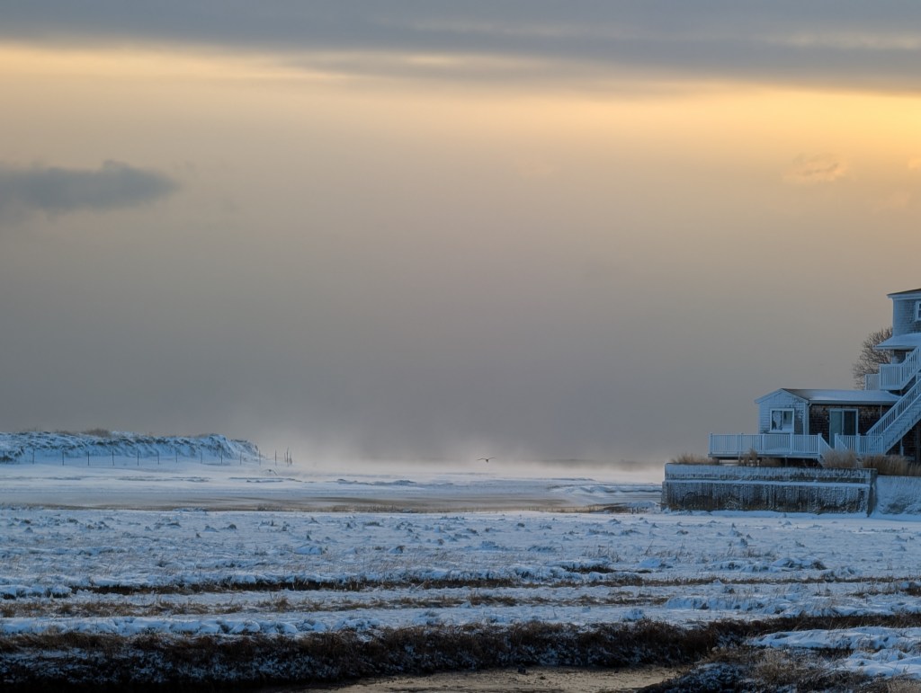 photos and video: Rooftops, beaches, and robins. Views from the road plus two winter walks on Wingaersheek Beach–yesterday vs. snowfall today. Jan. 19 (icy blue puddles and sheen) vs. Jan. 20 (yellow light, soft and silent).