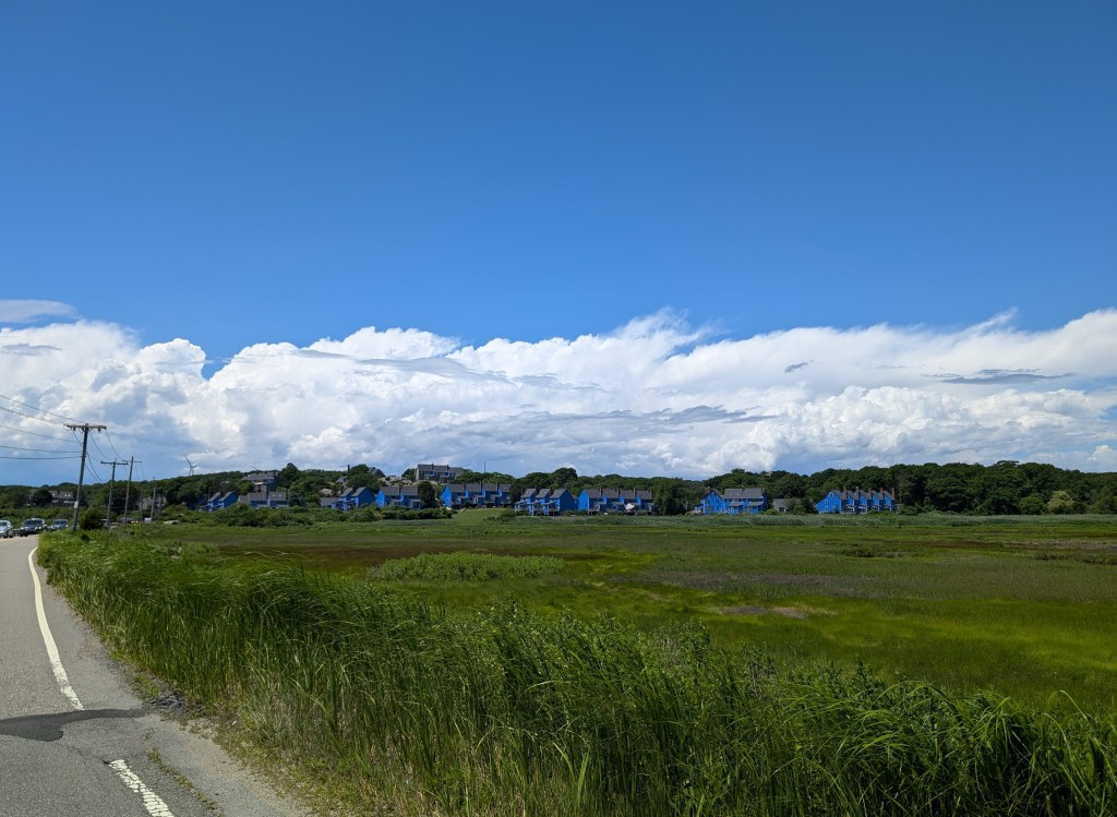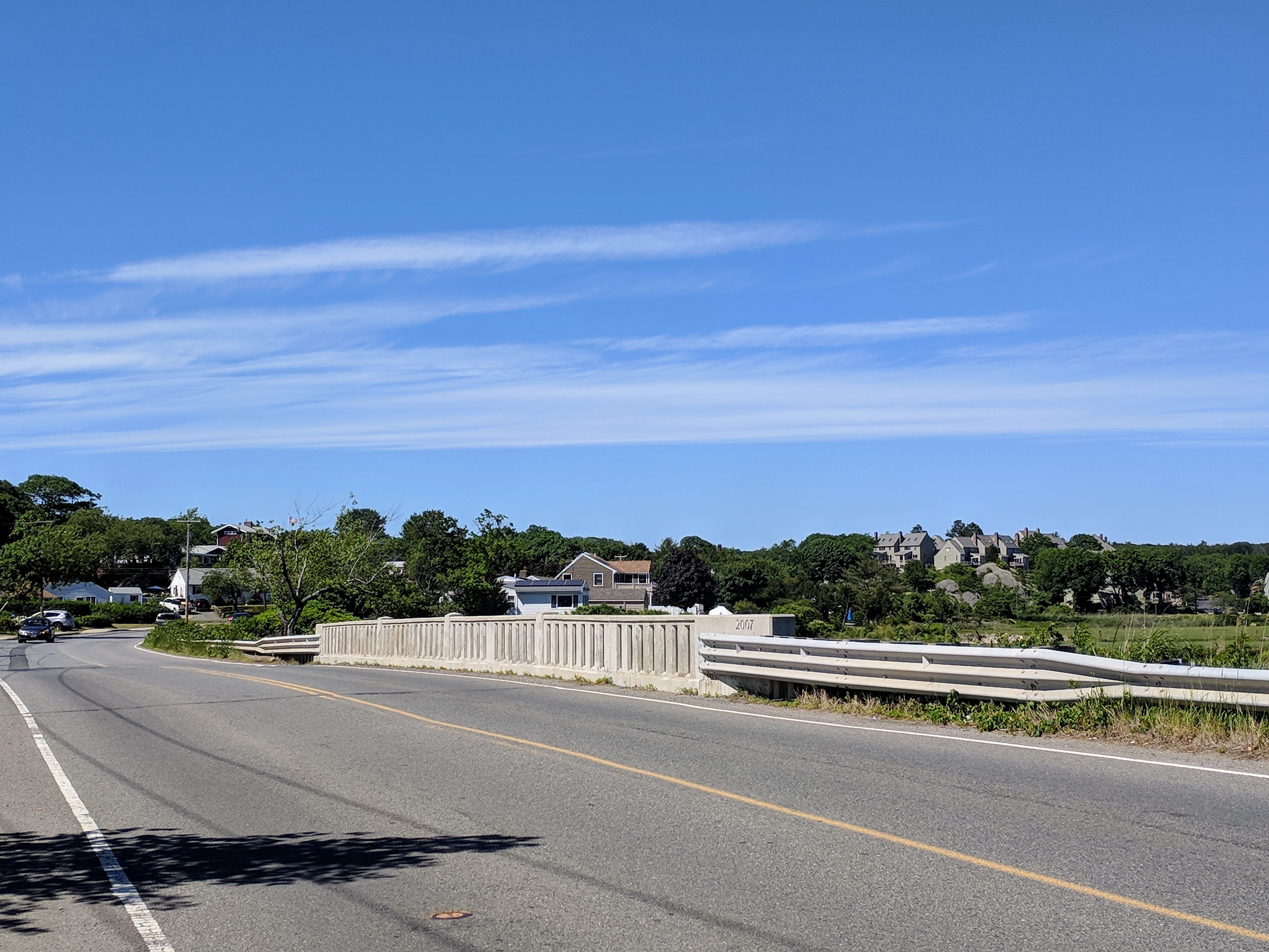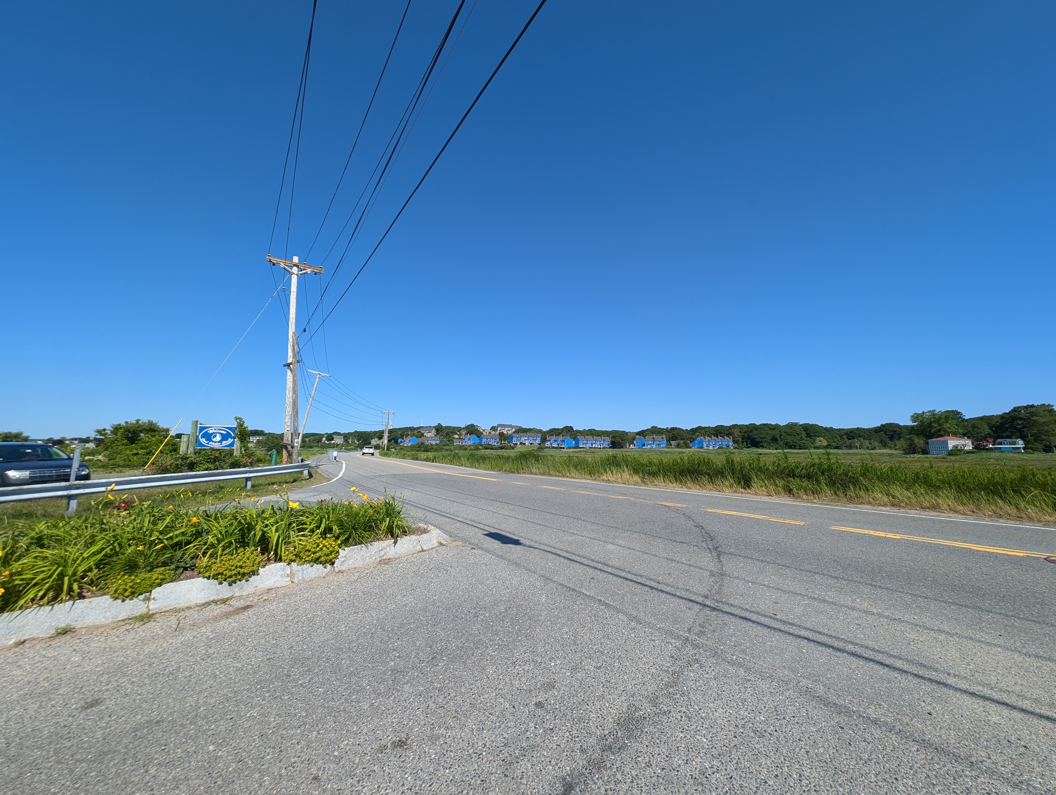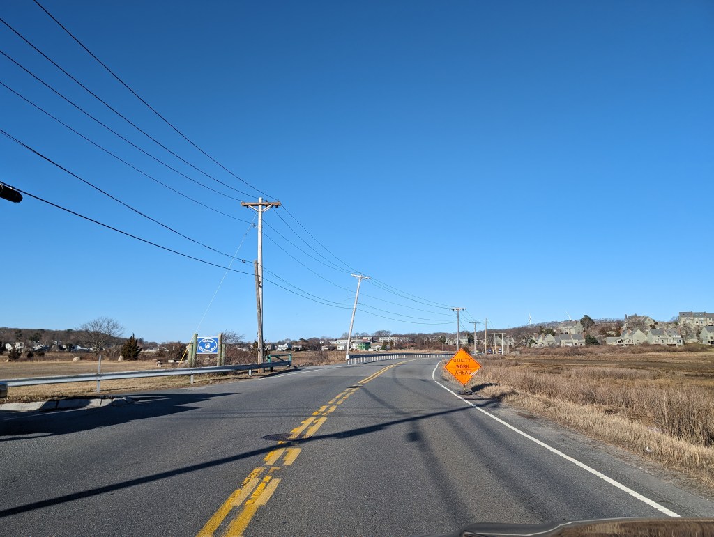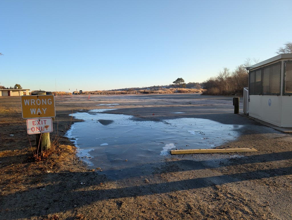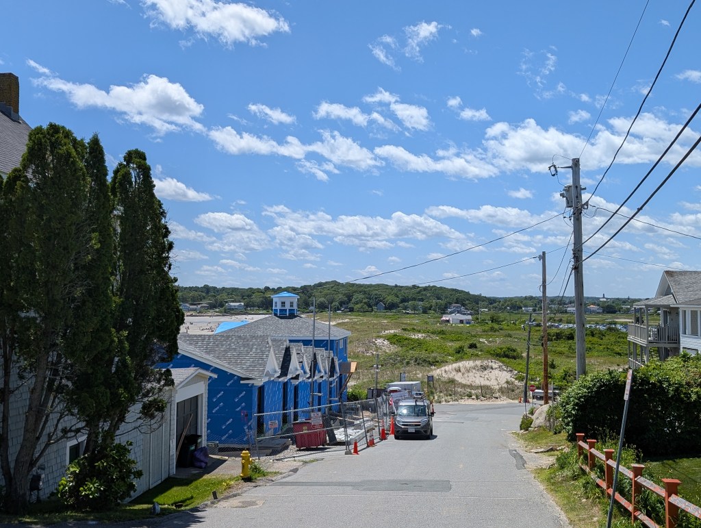 Utility work on Thatcher. View back to Old Nugent Farm condos on the right and Good Harbor Beach parking lot sign on the left.