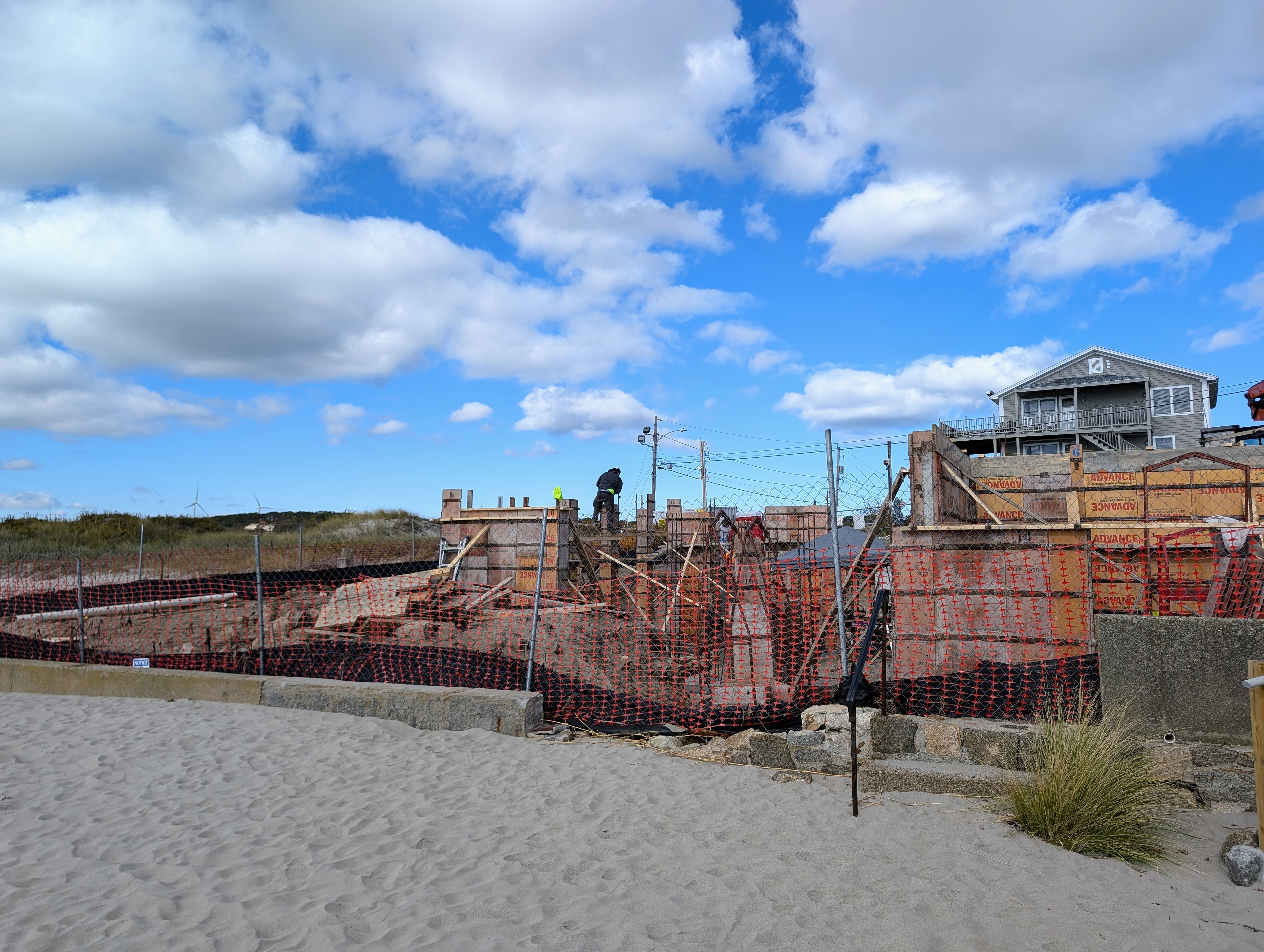 photos mid October, 2024: The construction crew is busy with framing, foundation and forms for the main building for Good Harbor Beach Inn. Fill and trucks occupy the uphill ground until that phase in construction when the guest lodgings will be framed out again.