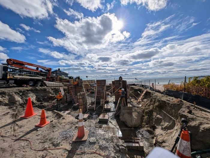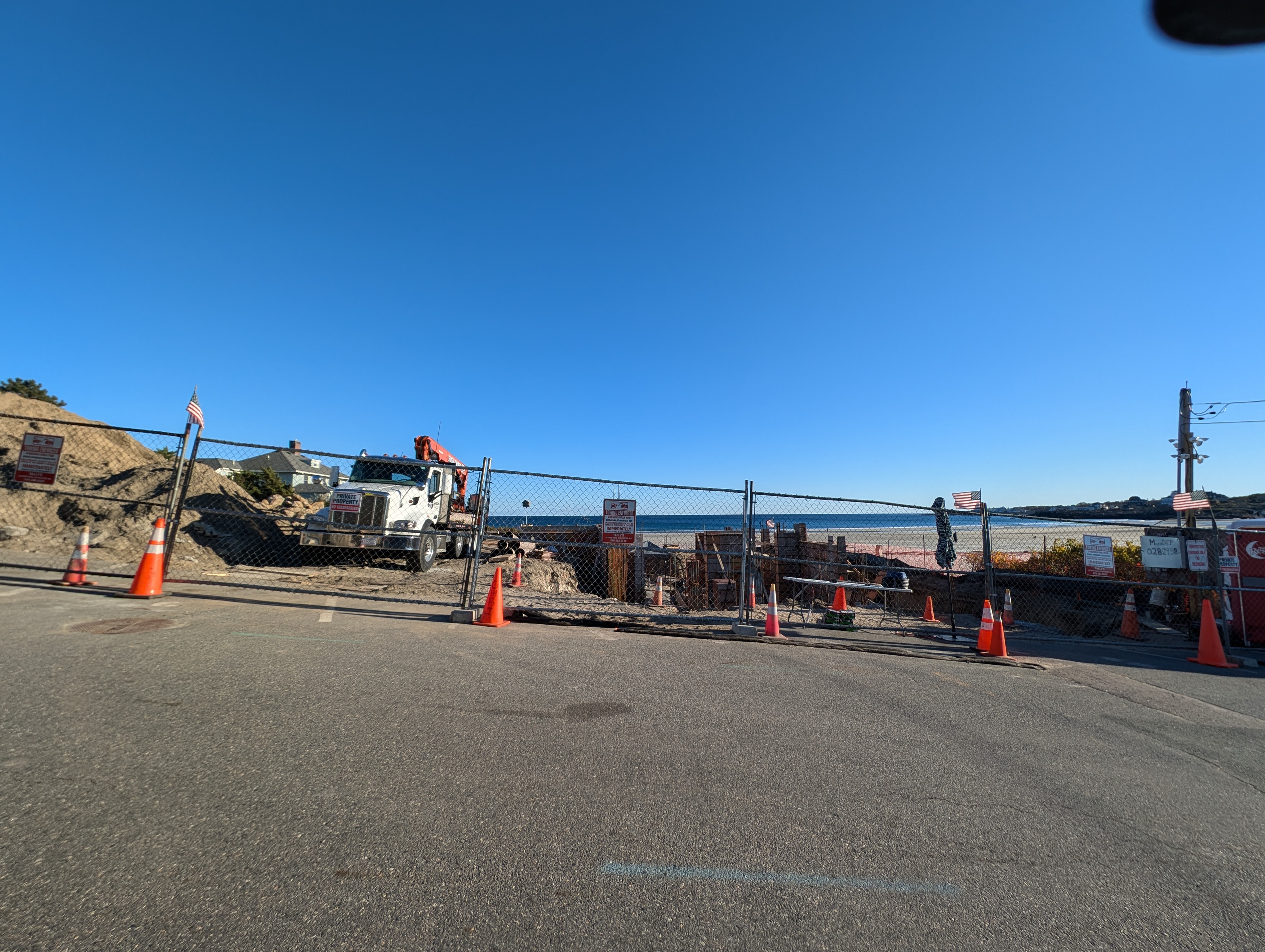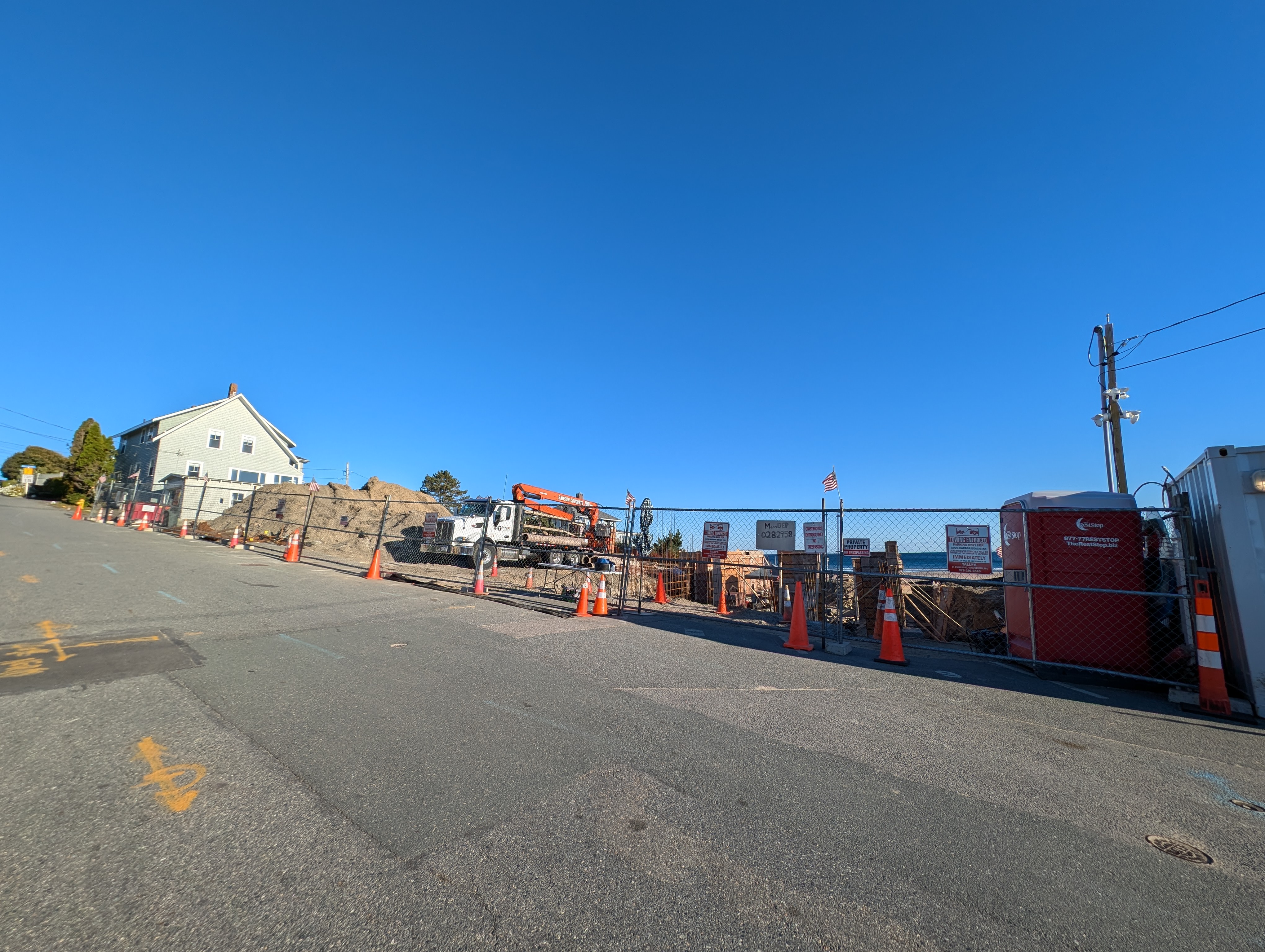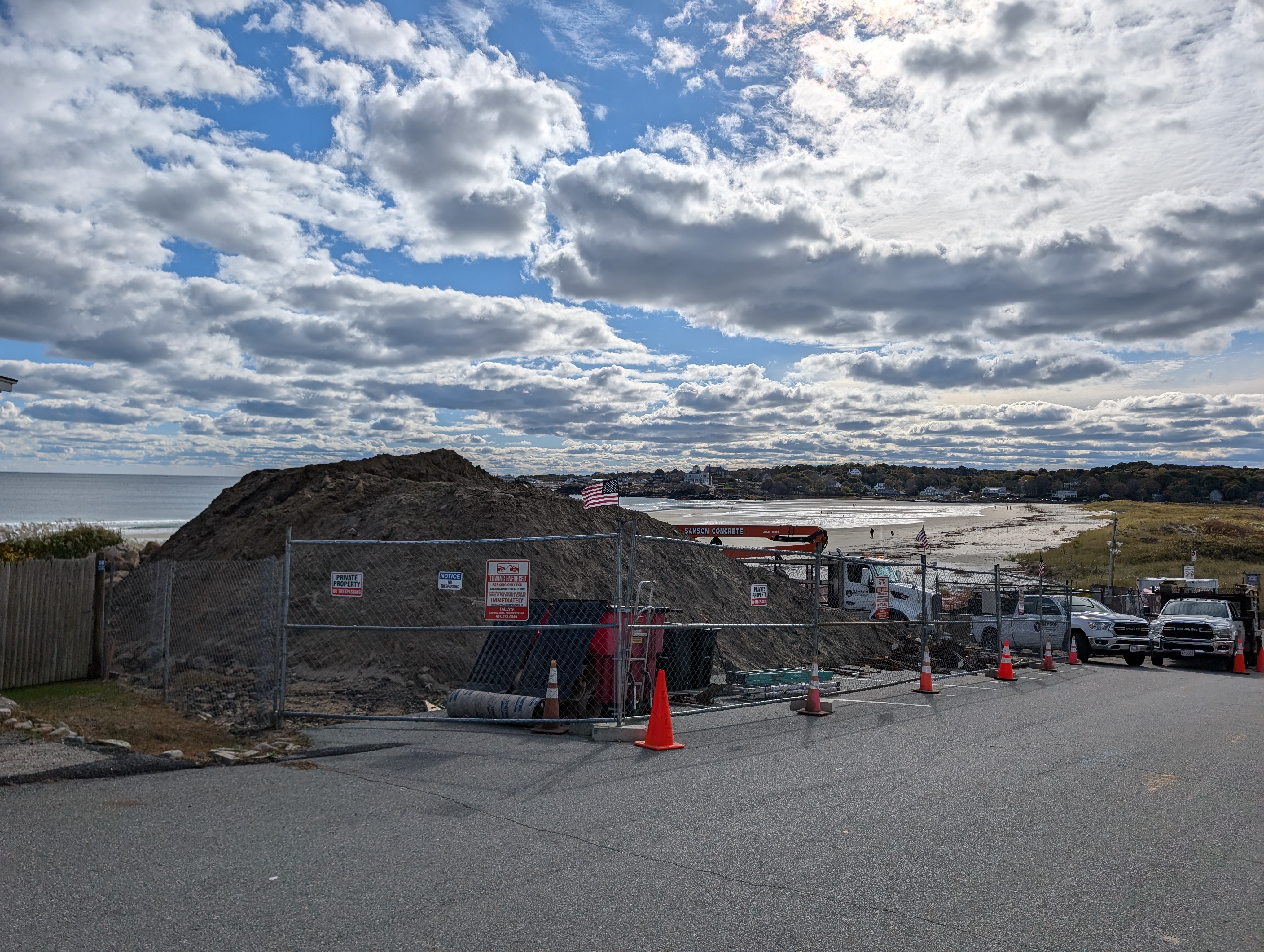 After a lull in construction on the Good Harbor Beach Inn site — reflecting 3 months fine-tuning the engineering plans just so– the foundation digging for the anchor lobby building has commenced for this scenic property across from Salt Island.