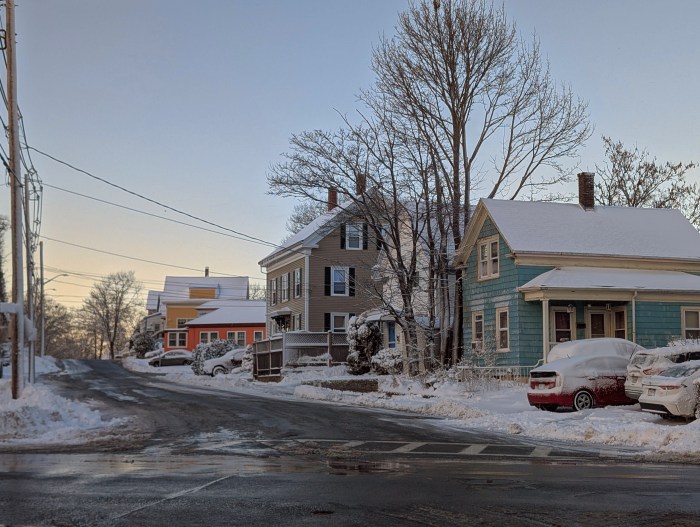 photos and video: Rooftops, beaches, and robins. Views from the road plus two winter walks on Wingaersheek Beach–yesterday vs. snowfall today. Jan. 19 (icy blue puddles and sheen) vs. Jan. 20 (yellow light, soft and silent).