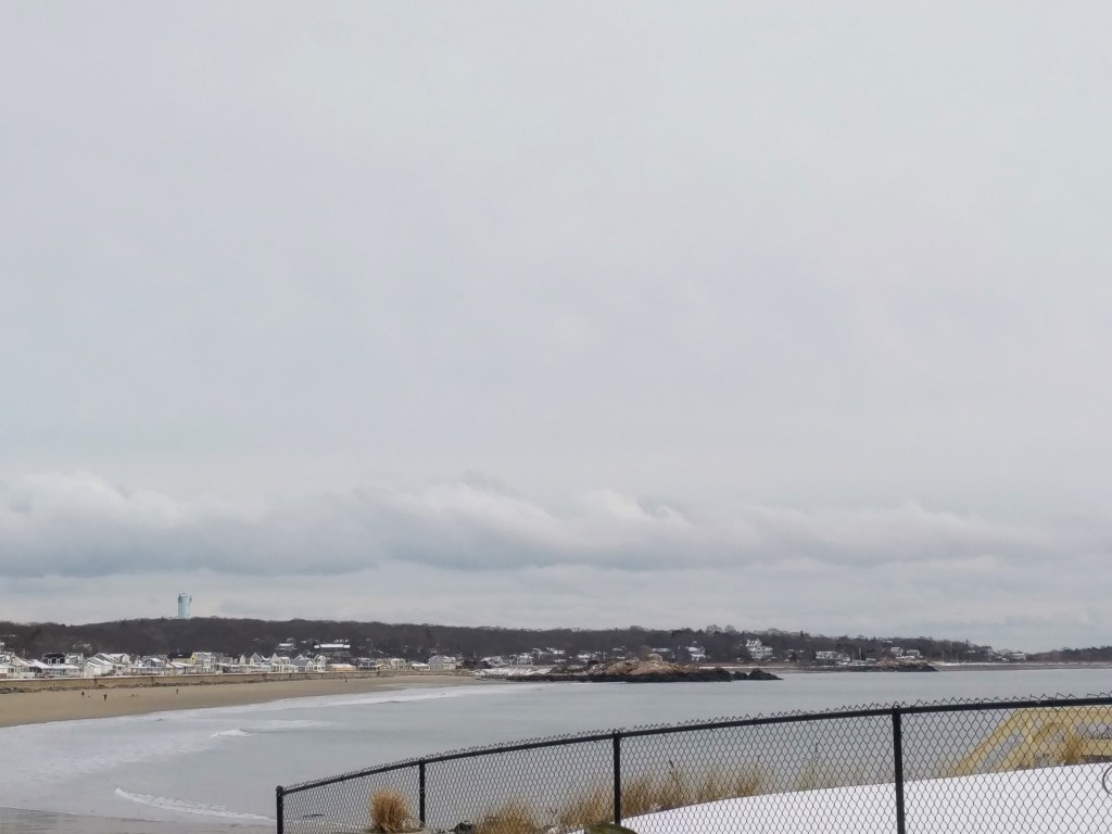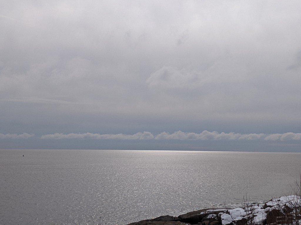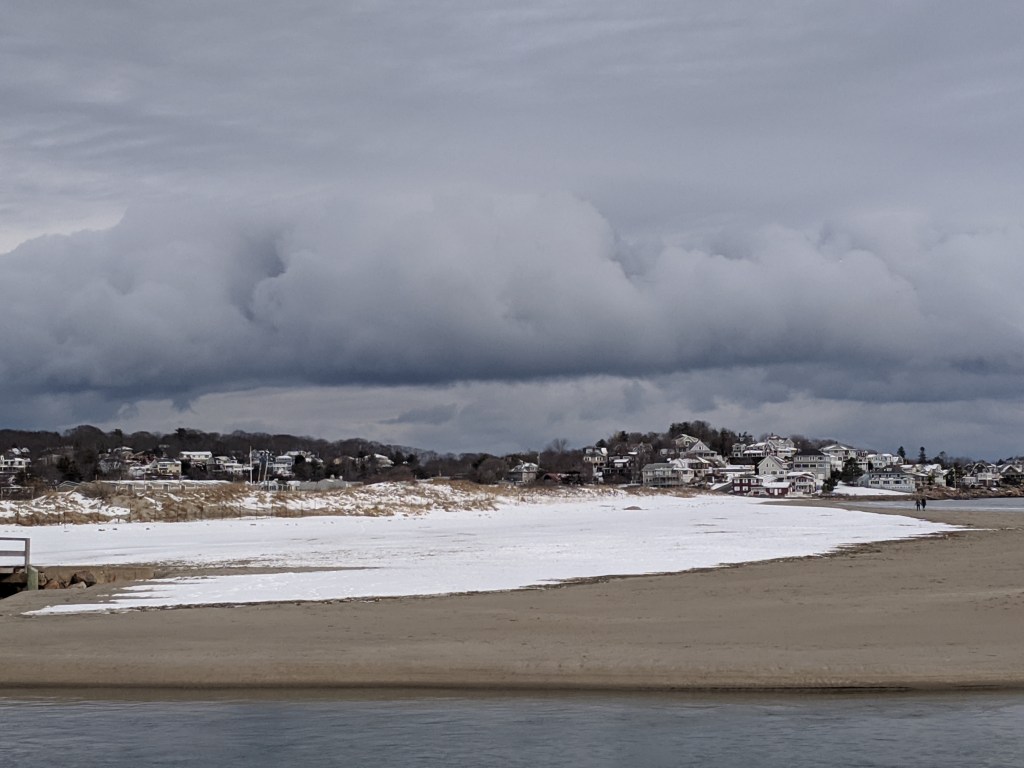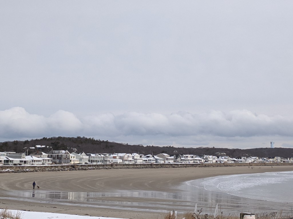January sky 1/25/2023, Gloucester, Ma. This morning’s elongated cloud roll/cloud shelf tube wrapped around the coast and tapered to a funnel horn tip. Views passing Good Harbor Beach and Long Beach
