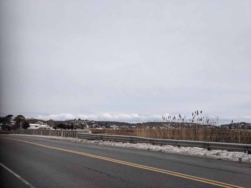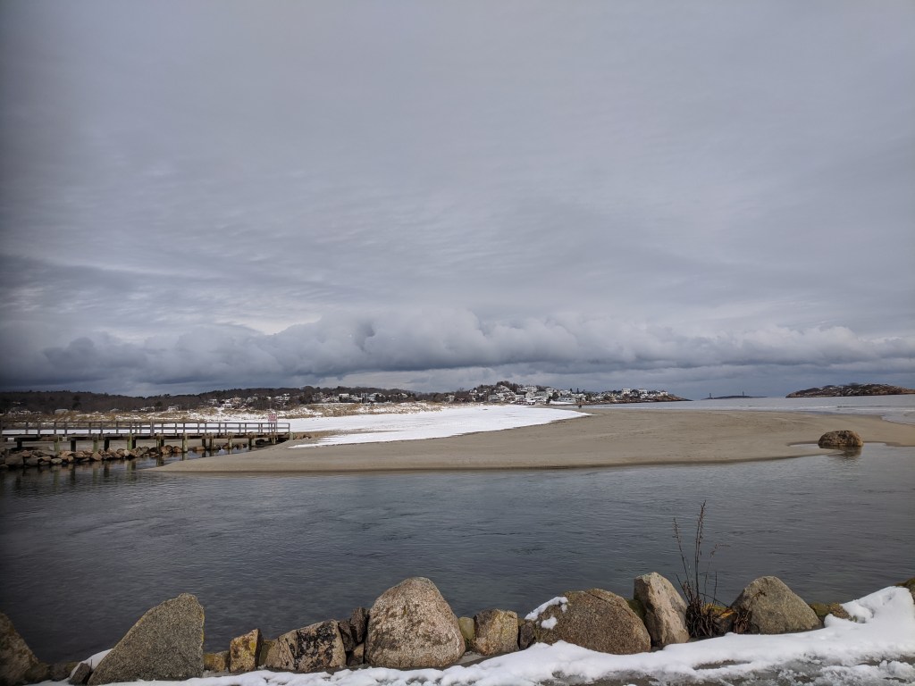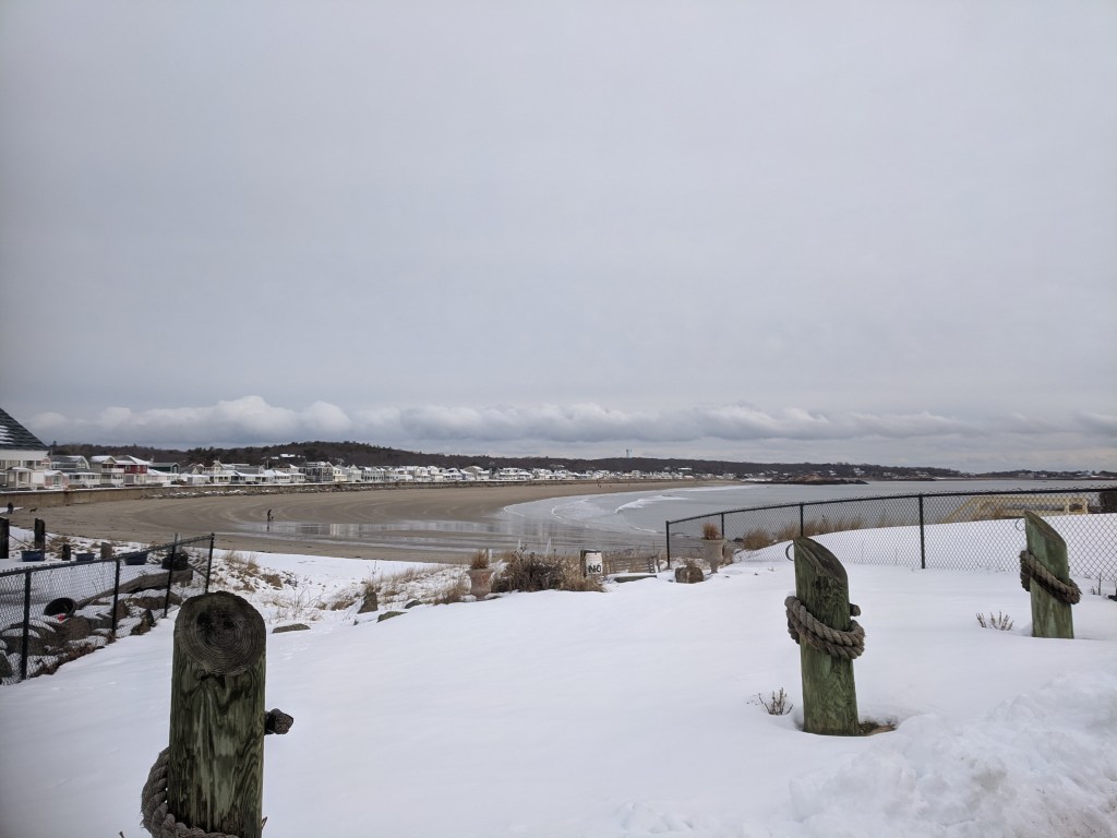 Gloucester 1/24/2023: Yellow and gray streaked sky, roads clear, and light accumulation from yesterday’s snowfall. Despite the sunny and warming up that’s forecast, there should be enough snow when school lets out suitable for building a snowman and slow sledding!