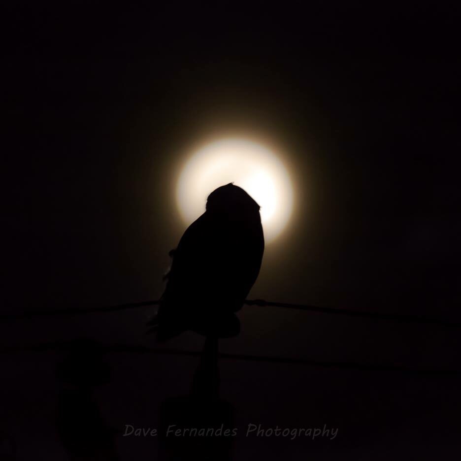 Sometimes things just line up for you. While watching and waiting for our Snowy Owl to take flight and hunt,, she landed on this telephone pole perfectly aligned with the moon..