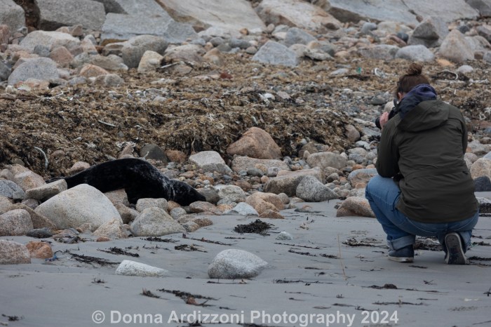 Grey Seals are not necessarily gray. They are also black and brown. Their spots are more irregular than the spots of a Harbor Seal.