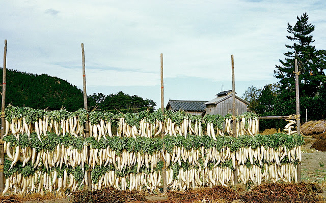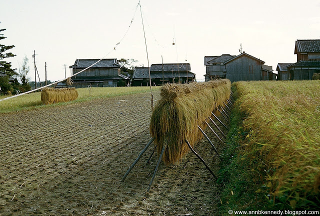 I am thoroughly enjoying the wealth of beautiful snapshots of Japanese landscapes and post war culture, and especially the collection of photographs of everyday life; with photos of rice fields and vegetables, wildflowers and children gathering fruits beneath a gingko trees, woodblock prints, fascinating recipes, and lovely brush and ink illustrations painted by Bonnie.