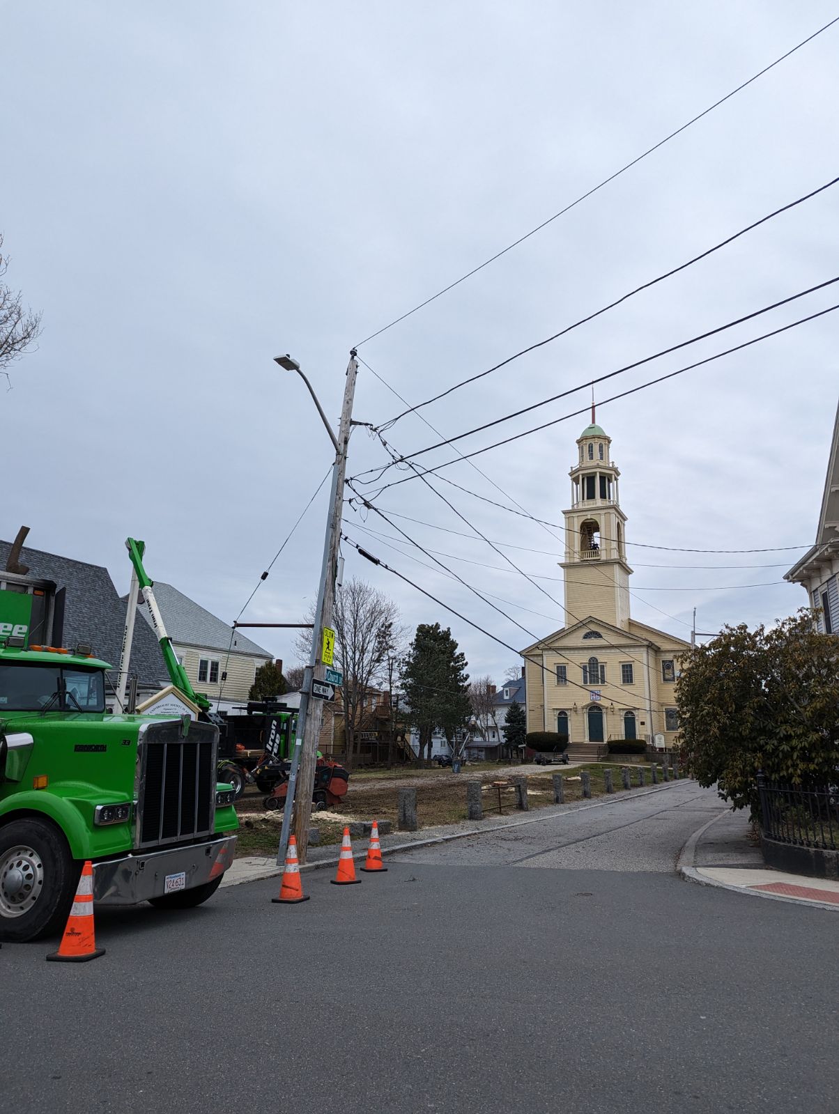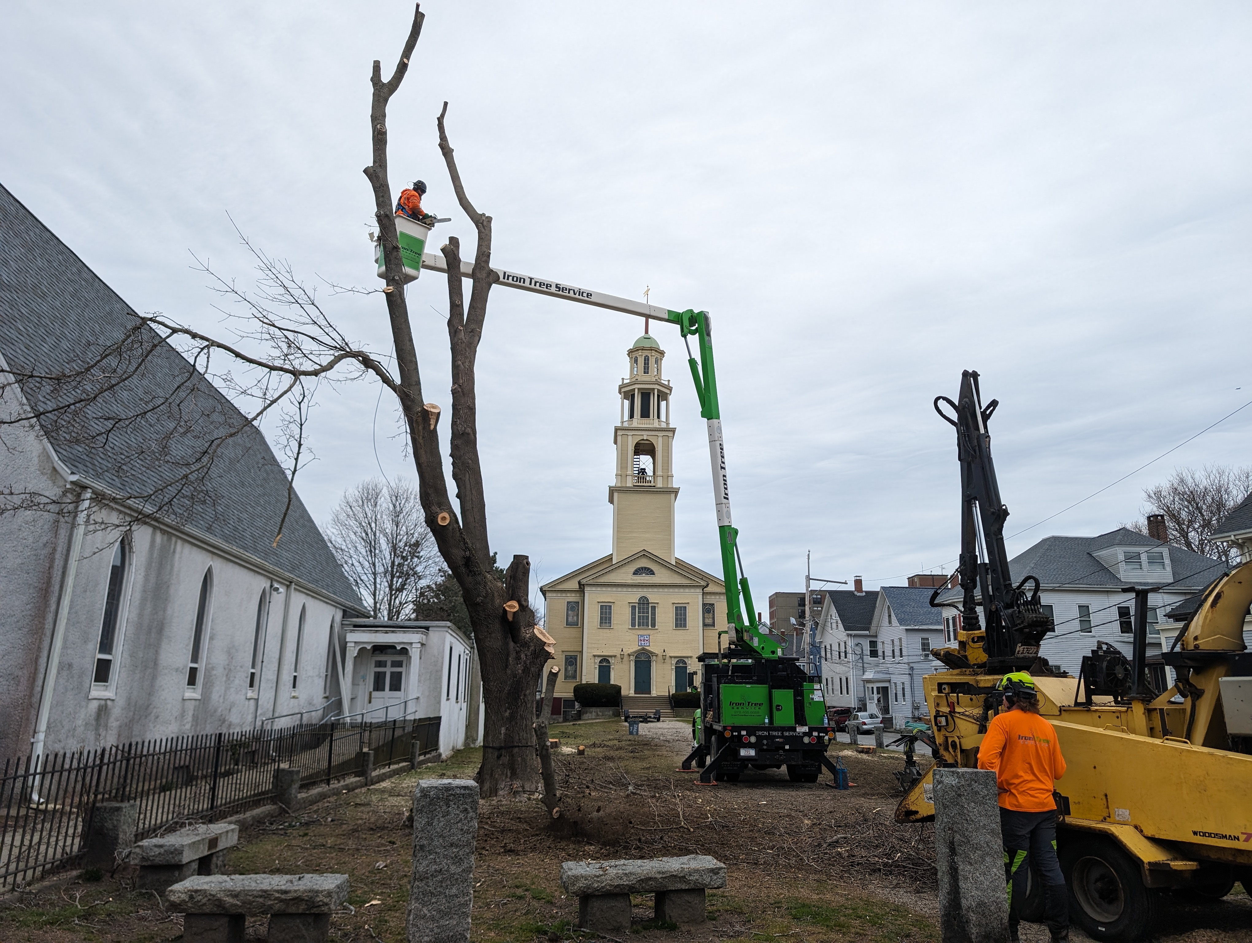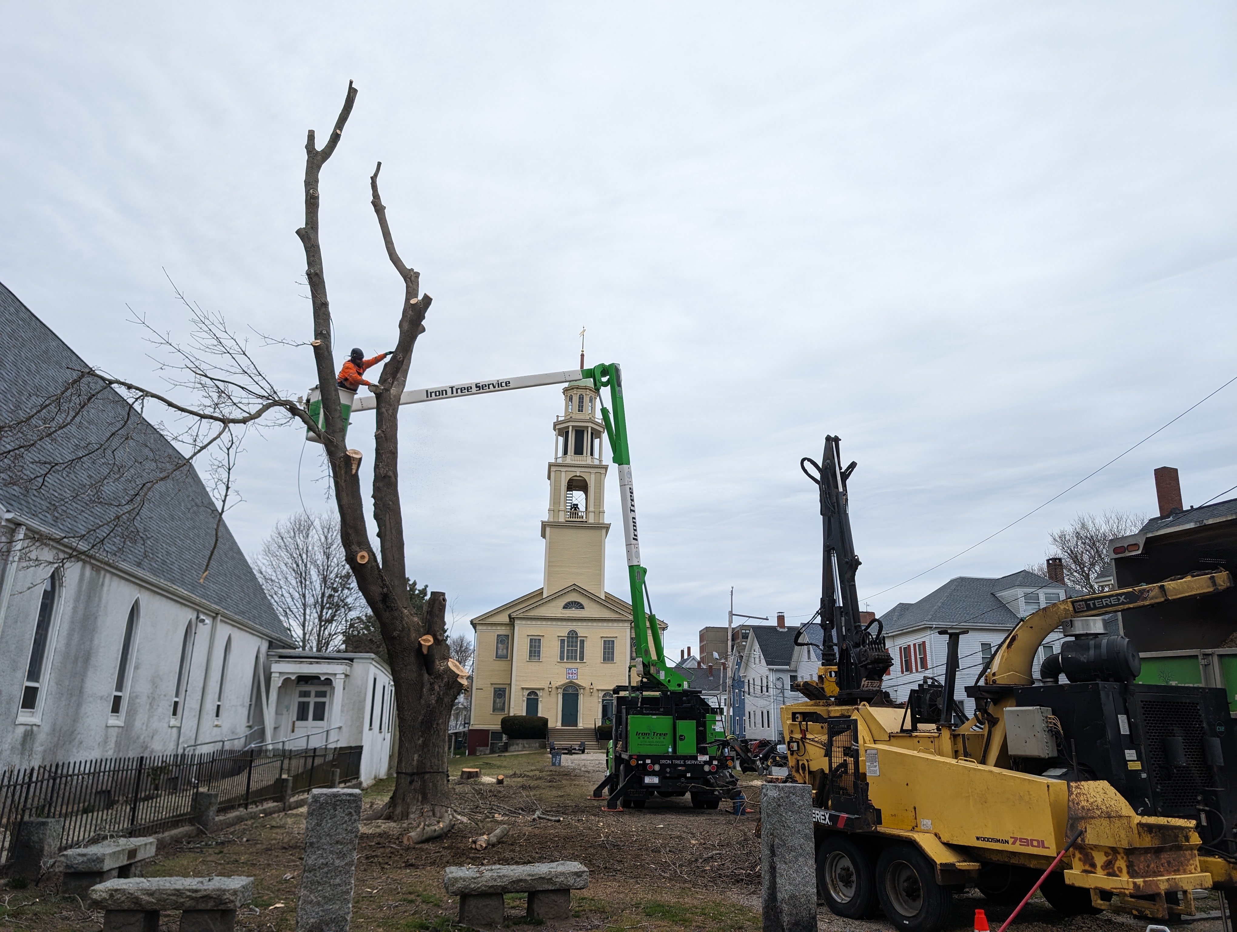 photo caption: Tree removal at Gloucester Unitarian Universalist Church, allee away, April 1, 2024.