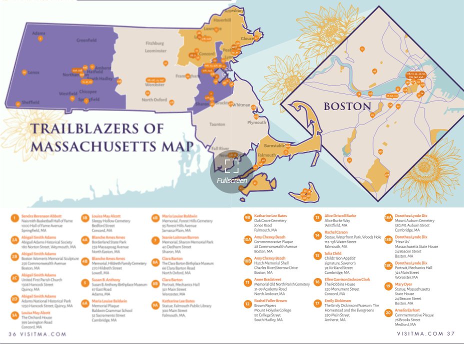 “August 26, 2020 commemorated the 100th Anniversary of the signing of the 19th Amendment granting women the right to vote. This historic anniversary of suffrage was the perfect time to celebrate our Massachusetts Foremothers, more than 70 amazing women whose contributions to the Commonwealth, the nation and the world are unparalleled and who are recognized as “Trailblazers” in their fields. Click here to learn about the stories of these remarkable women and their ties to Massachusetts, The Woman Suffrage Movement, commemorative sculptures and statues at the Massachusetts State House, the significance of the Sunflower, the Colors of Suffrage and much more!“