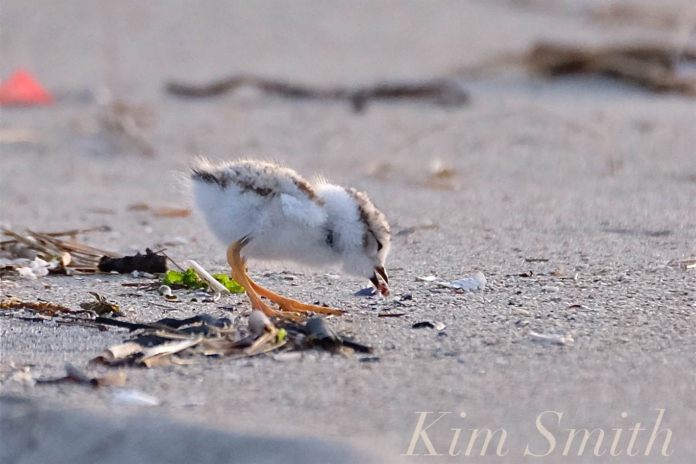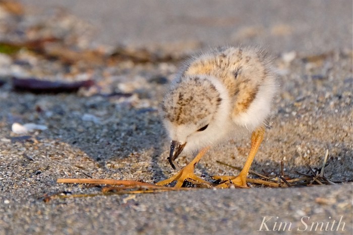 Piping Plover chicks eat everything the adults eat, only in smaller bites, and pretty much anything they can catch. We’ll often see the chicks pecking repeatedly in one spot. Unlike Mama and Papa PiPl, they don’t always eat the insect in one swallow. The chick will chase after the insect and eat it in several beakfulls.