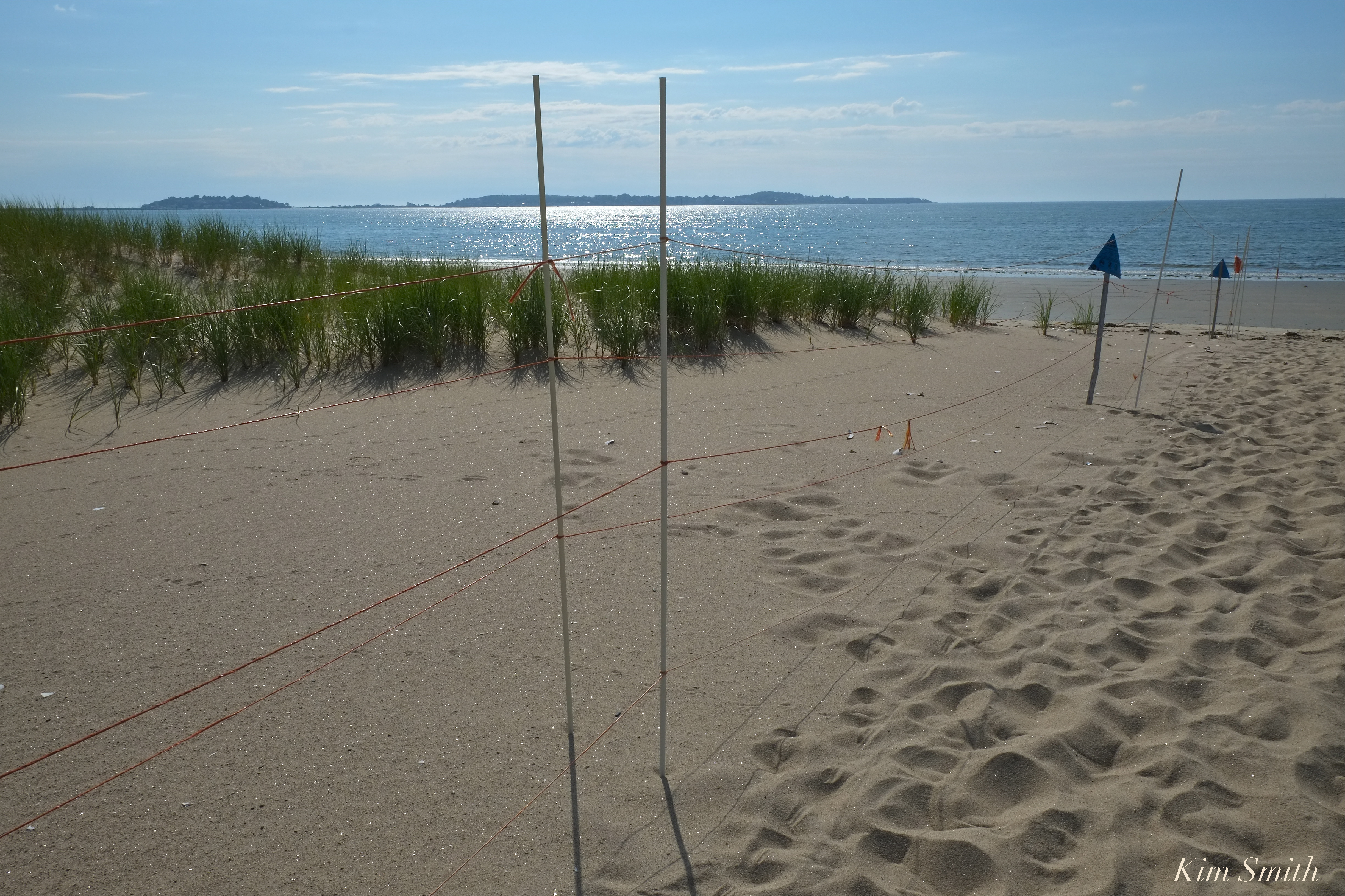 Wooden poles are used to post the nondescript, but informative endangered species signs. According to DCR staff, the only time they have complications with the fencing is when the wooden posts are tied into the fiberglass poles and the tide takes both down.