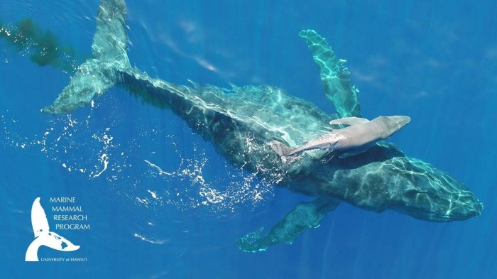 The humpback whale calf is so new that its dorsal fin and tail flukes appear soft and flimsy, and its mother is still excreting blood, while sometimes supporting the calf on her back. The rare video minutes after birth was captured by the University of HawaiÊ»i at MÄnoaâs Marine Mammal Research Program (MMRP) in January 2019.