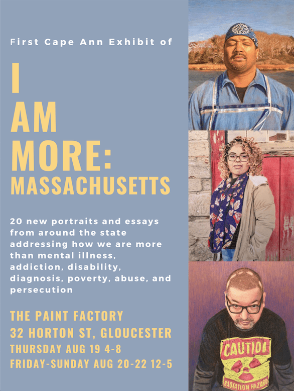 This Thursday the I Am More: Massachusetts touring exhibit will join the Cape Ann Makers Market at the Paint Factory, hosted by Ocean Alliance, upstairs in the newly-renovated copper mill building as part of Gloucester’s Culture Splash series of events from 4-8 pm. This is the first Cape Ann exhibit of twenty new portraits and essays from around Massachusetts addressing topics such as opioid addiction, postpartum depression, PTSD, cancer, suicide, and disability. Wellness resources will be available from NAMI Cape Ann and Rep. Seth Moulton. Viewers requiring handicap access can view the entire I Am More collection of 36 portraits and essays at the Salem State University Berry Library from September 1st through November 30th.