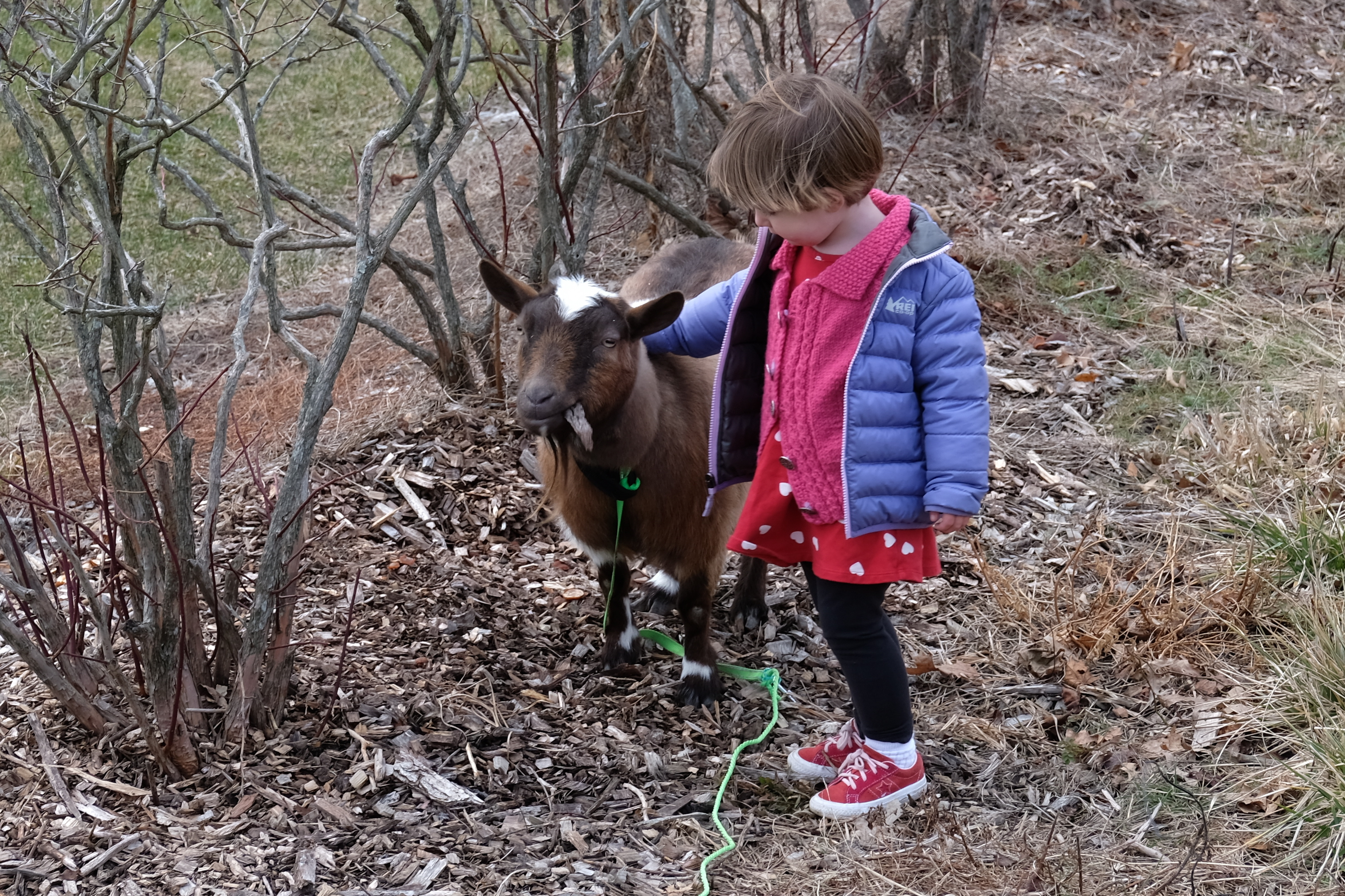 Next destination was a visit to see the farm friends at Tendercrop Farm. Currently in residence are a turkey, ginormous steer, pony, chickens, ducks, llama, and the sweetest miniature goat who is just wonderful with toddlers.