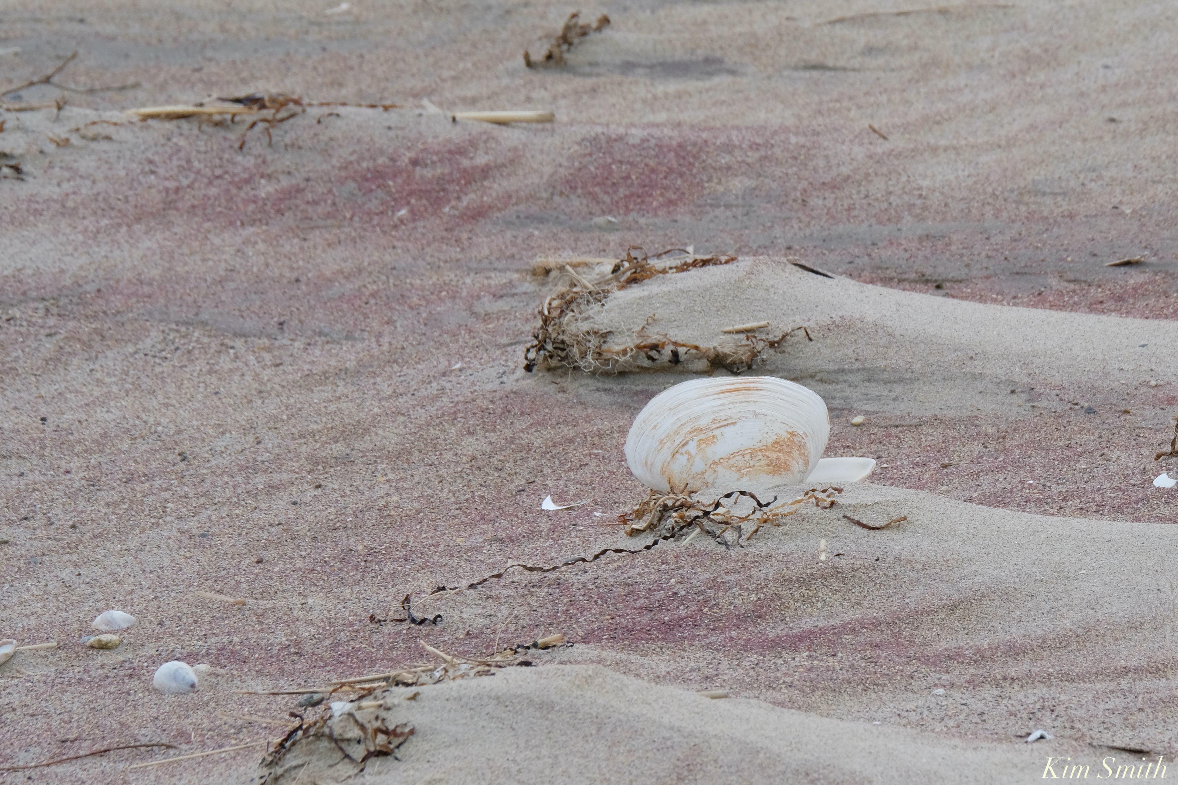 The pink and purple are mineral deposits of rose quart and garnet and come to north of Boston beaches via the White Mountains. Water and wind worn rock is carried in river waters until it meets the ocean and becomes deposited on barrier beaches. We mostly see the garnet and quartz deposits in winter as storms erode the dunes, leaving the heavier minerals exposed. During the spring and summer, the lighter white quartz sand blows back over the dunes and covers the heavier sand.