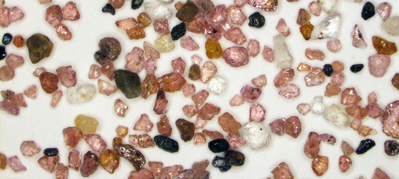 At first look under the optical microscope, the granules of sand appeared like scattered jewels of many colors; predominantly glassy pink angular grains, with smaller quantities of milky white rounded grains, clear angular grains, black grains (some magnetic and some not), and even the occasional green.
