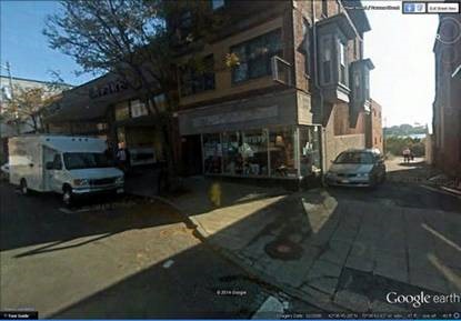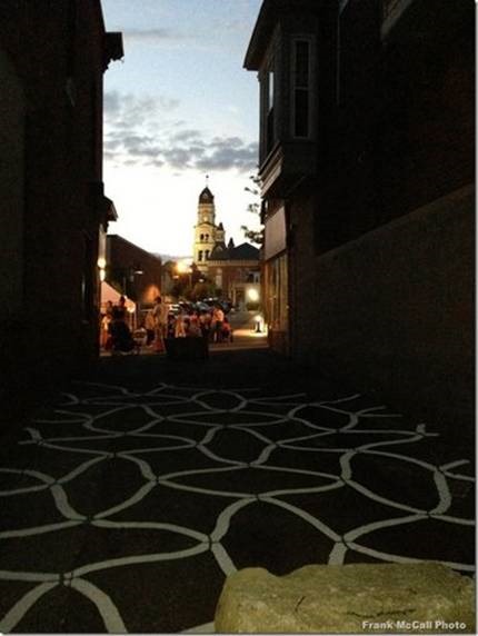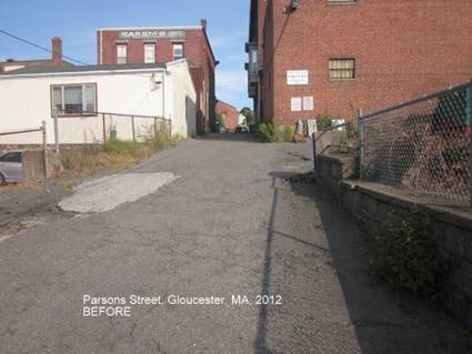 Exterior mural could be visible from the next blocks: oblique angle view back to mural wall on Elm Street from Pleasant Street (between Cape Ann Museum and Jane Deering Gallery)