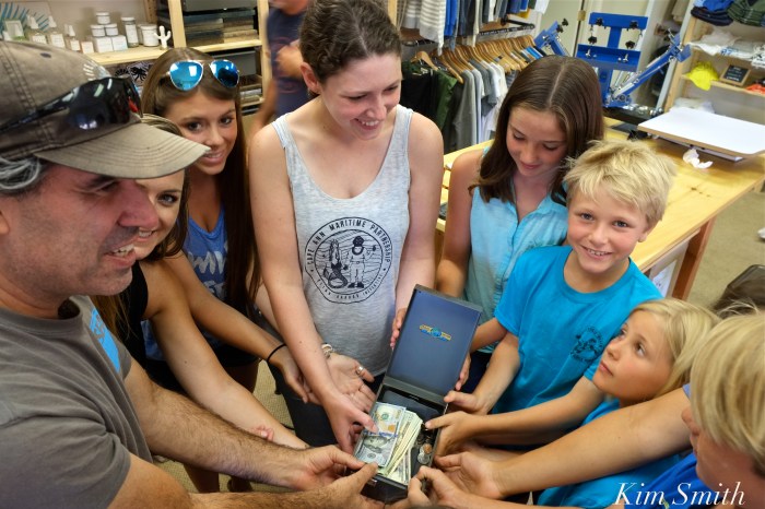Over the summer, our East Gloucester neighborhood kids Atticus, Meadow, Pilar, Frieda, Lucas, and Sabine formed the club Plastic: Pick it Up!, a kid’s campaign for getting plastic off roadways and beaches so it doesn’t end up in our oceans. Through their lemonade stand, the club raised a whopping 540.00!! On Wednesday evening they, along with Jackson, visiting cousin from North Carolina, met with members of Cape Ann Maritime Partnership (CAMP) to donate the money raised to help purchase a Seabin and Marine Skimmer, marine technologies designed to clean up oil and plastic garbage.