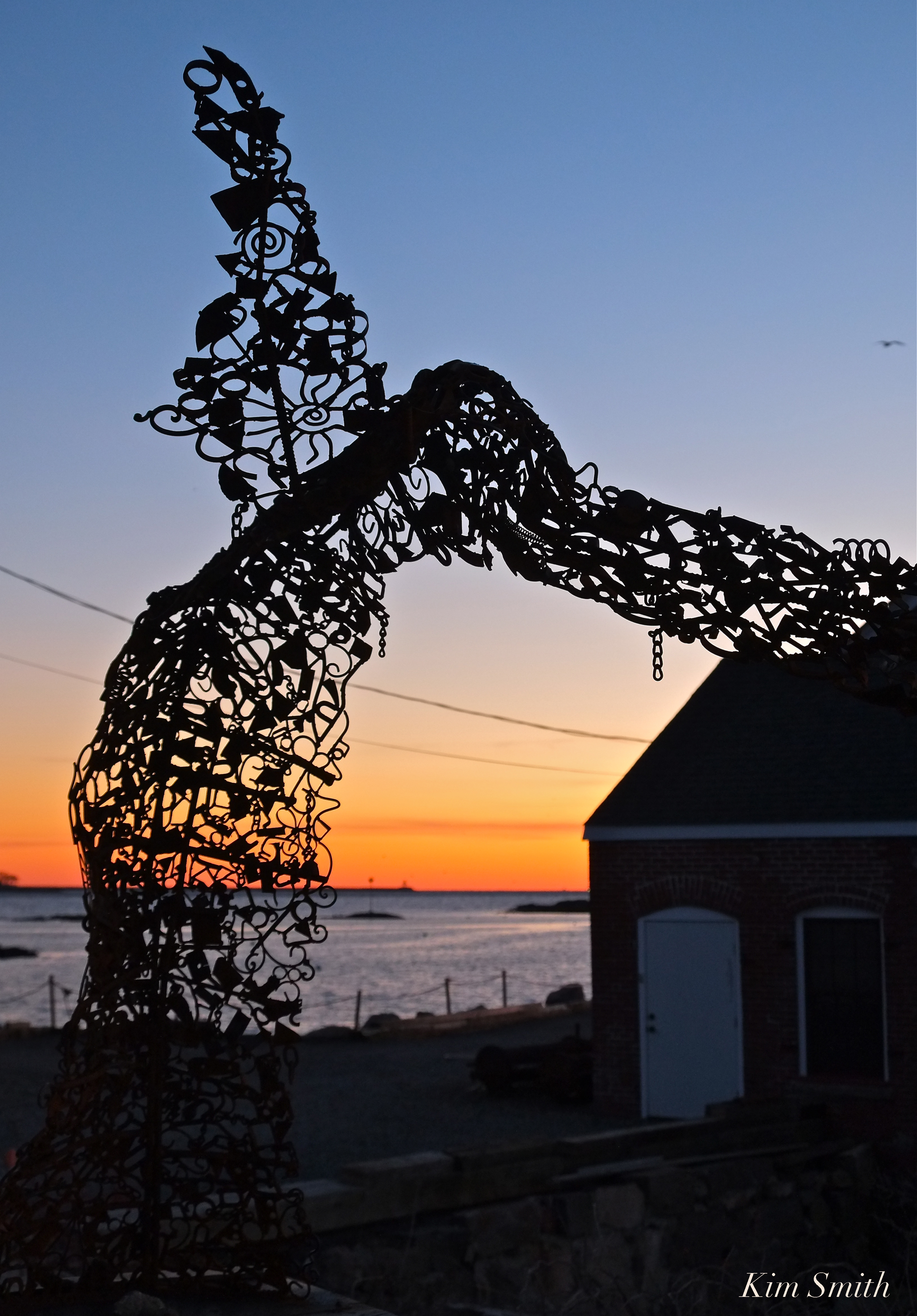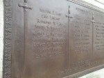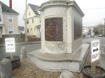 The exercises tonight at the dedication of the base of the monument were deeply impressive. Owing to causes beyond the Legion post’s control the statue could not be delivered in time for the dedication. The Cape Ann granite base, designed by Frederick G. Hall, a Boston artist, a summer resident of East Gloucester, had been placed in position with the bronze tablets bearing the names of the 57 youths who went from Gloucester to the World War never to return. The base was draped with the Stars and Stripes. At each corner of the base was a column. On each of these four columns, in black and white, were Romanesque braziers. These braziers were lighted, also four incense urns. The faces of the thousands who stood with bared heads were illuminated.