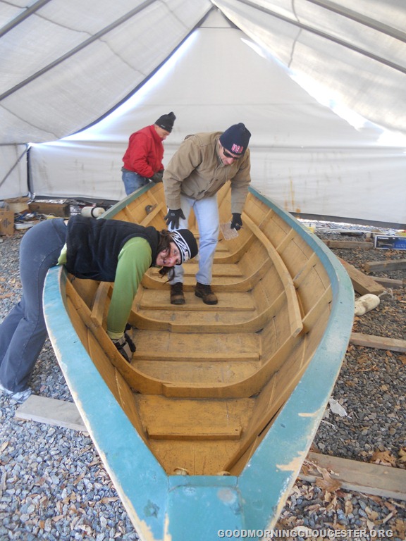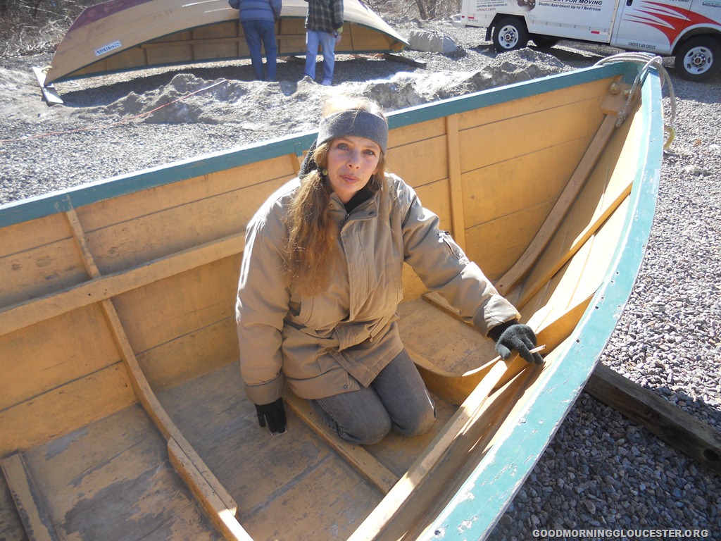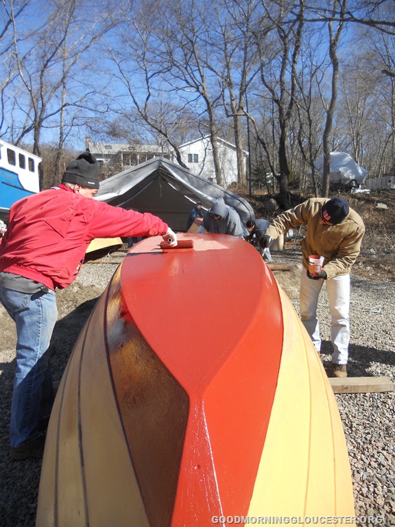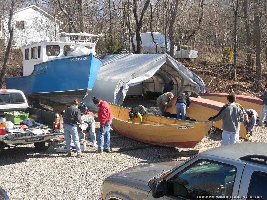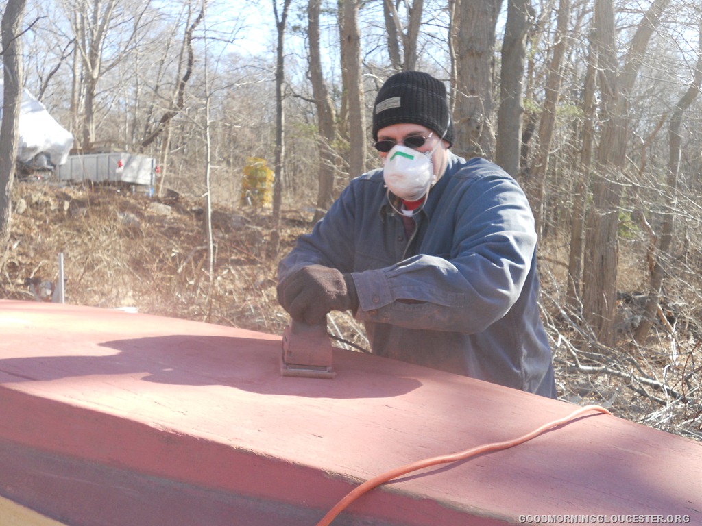The Dorys don’t just maintain themselves. It takes a group effort to keep these boats in racing shape. The email was sent out last week to all the members of the International Dory Race organization and I’m sure when they sent out the invitation to join in and sand, powerwash and paint the dorys that no one imagined that it was going to be under 32 degrees at the end of March. But that’s what mother nature dealt.