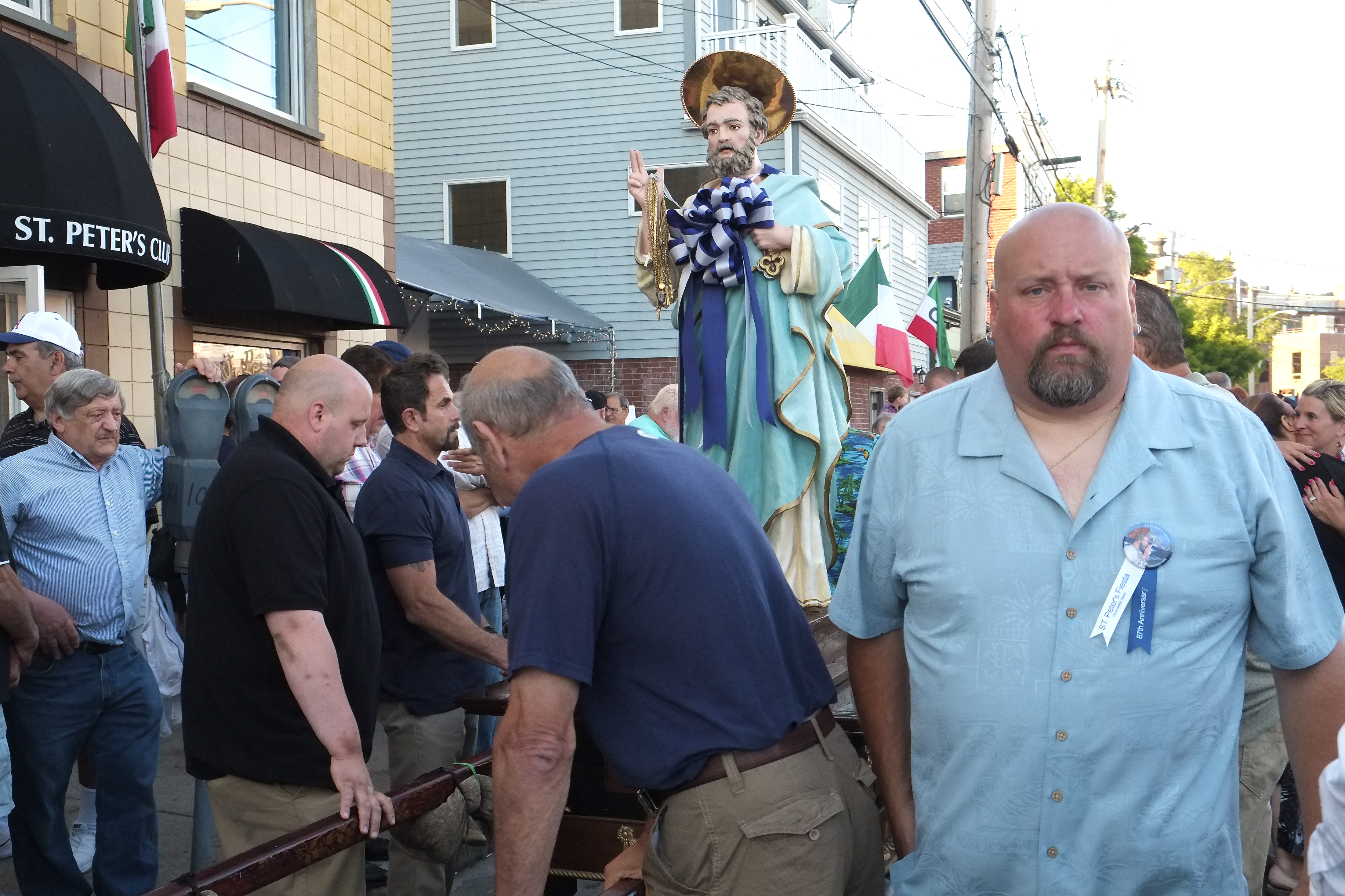 Friday’s picture perfect summer skies made for an especially festive and at times poignant Saint Peter’s Fiesta grand opening ceremony. Festival-goers gathered at the Saint Peter’s Club and, after everyone who had participated in the day’s earlier sporting events had raced home to change, the procession carrying Saint Peter through the square and around the old city hall (American Legion building) began. Eight fishermen are given the honor of transporting Saint Peter on a specially crafted cart.