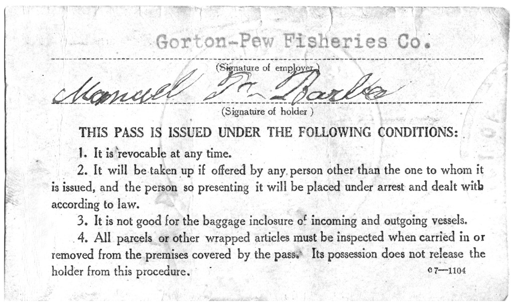 Below is an 1918 Water Front pass for Gorton-Pew Fisheries.