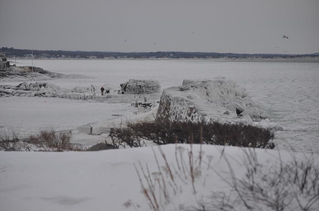 I took another walk to Lanes Cove after I finished my shoveling today. The water level was higher than yesterday’s high tide and the breakwater had quite a bit more splash-over. If you watch carefully, you will see water pouring through the breakwater as well. I could not stand in the same place where I took my video yesterday because that location was underwater!