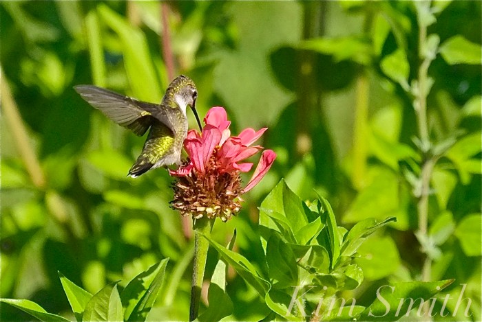 You can keep hummingbirds coming to your garden throughout the growing season by providing nectar-rich tubular-shaped flora in shades of primarily red, orange, and yellow (although I see them drinking nectar from a rainbow of hues), along with flowers comprised of small florets that attract small insects (the florets at the center of a zinnia plant, for example).