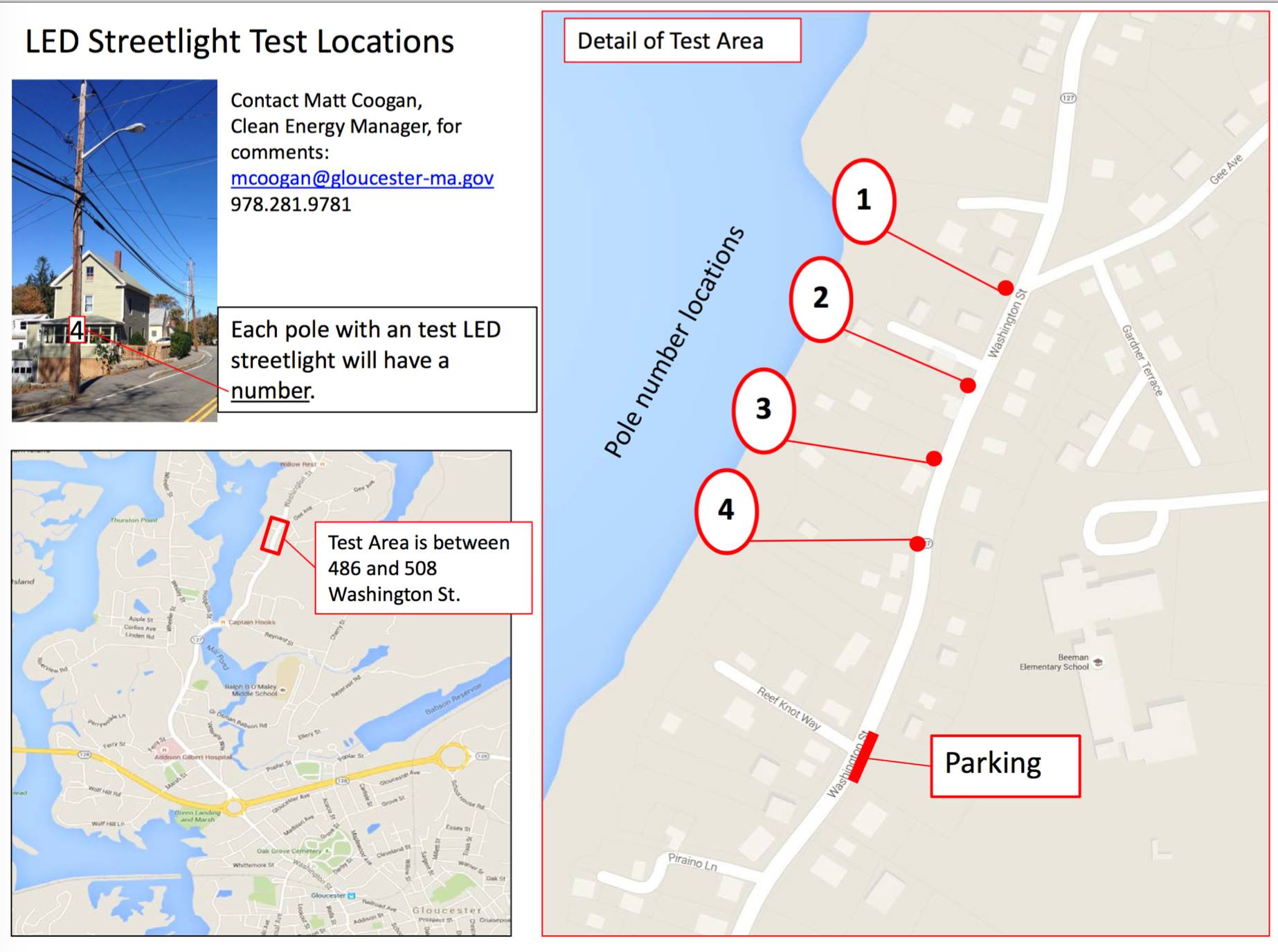 Two variations on LED streetlights being considered by the city have been set up for evaluation. The test installations are the first four lights on the west side of Washington Street just south of Gee Avenue.There are two types, rated at 3,000 degrees Kelvin and 4,000 degrees Kelvin. The “color” of the light is slightly different between the two types.