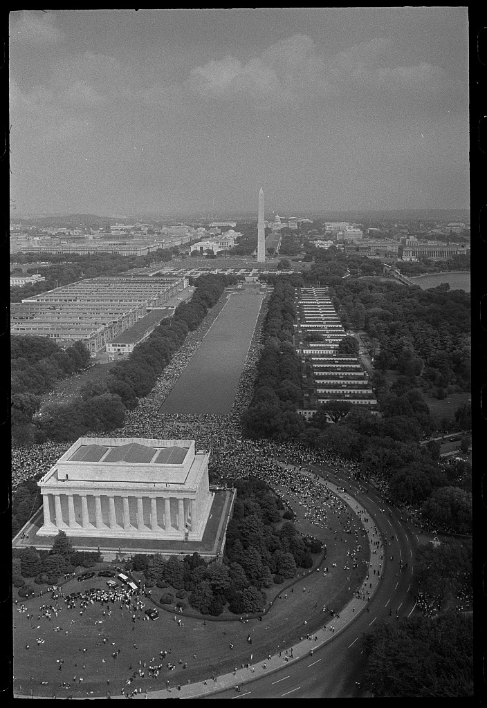 [photographer Thomas J. OโHalloran, aerial view of marchers, from the Lincoln Memorial to the Washington Monument, at the March on Washington, 1963, Library of Congress.]