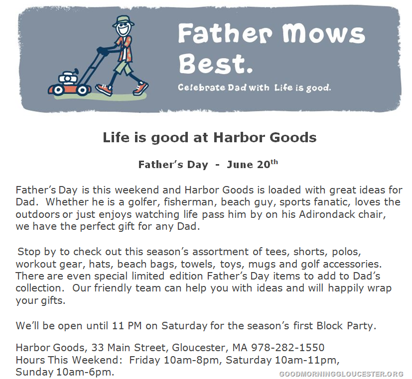 Harbor Goods will be having a Halloween Party. Info from the Chamber- Bring the kids to HARBOR GOODS on Halloween, Saturday, October 31 for some Life is Good(R) fun. Stop in between 12noon and 3pm for coloring, balloons, raffles, treats and sweets. Costumes welcome. 33 Main Street, Gloucester. 978-282-1550