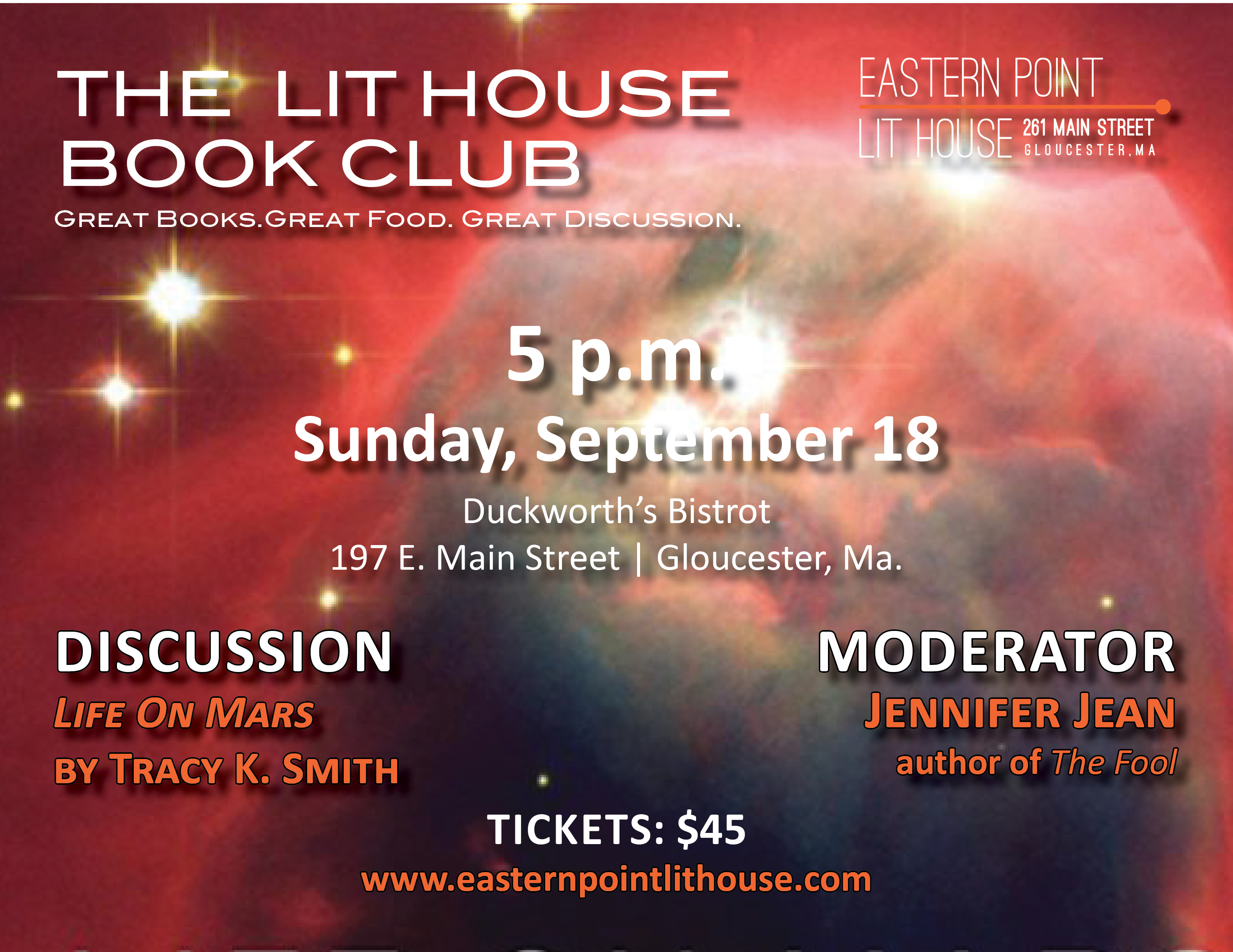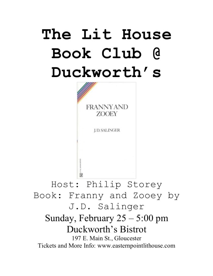 The Lit House Book Club @ Duckworth’s is the opportunity to hear writers talk about a book they love from a writer’s perspective while enjoying dinner at one of Gloucester’s finest restaurants. Participants are expected to be familiar with the feature book, as there will be open discussion during the event.